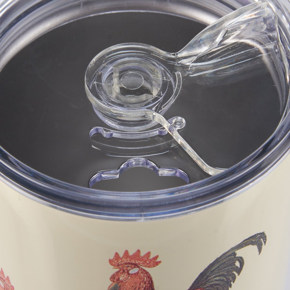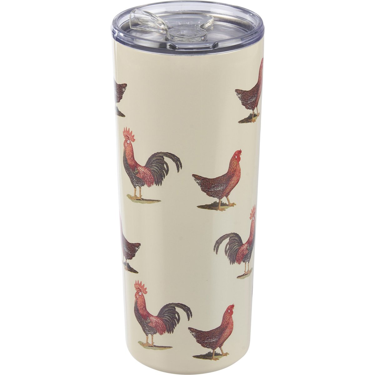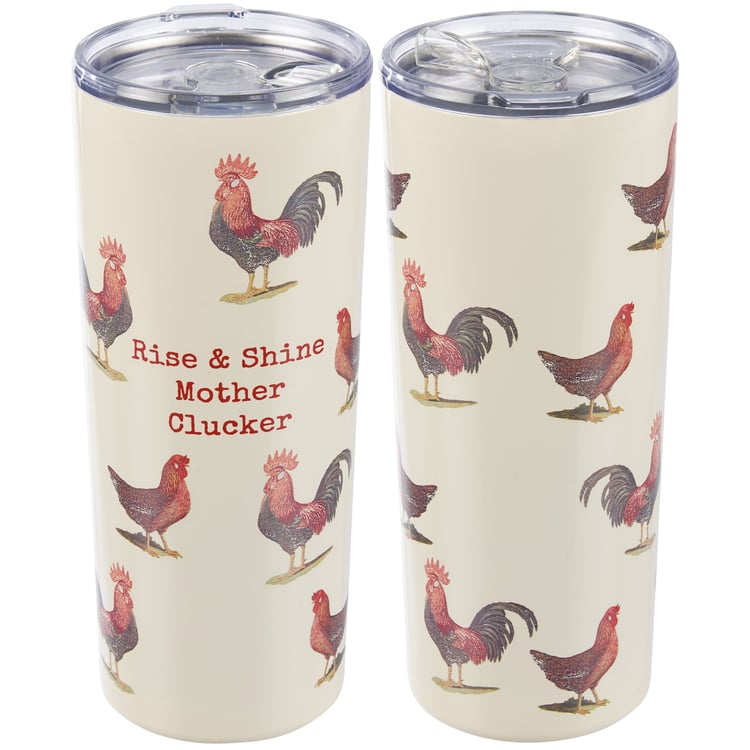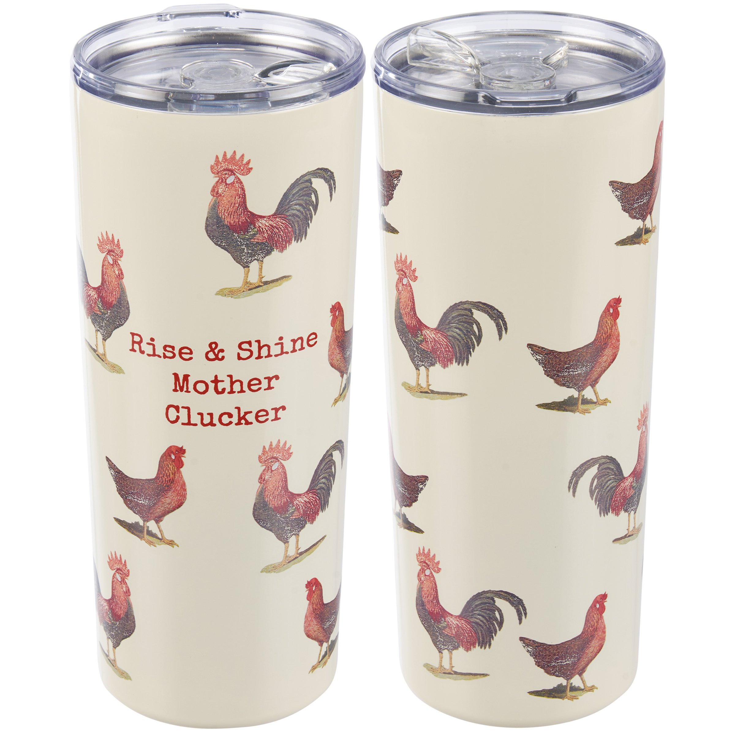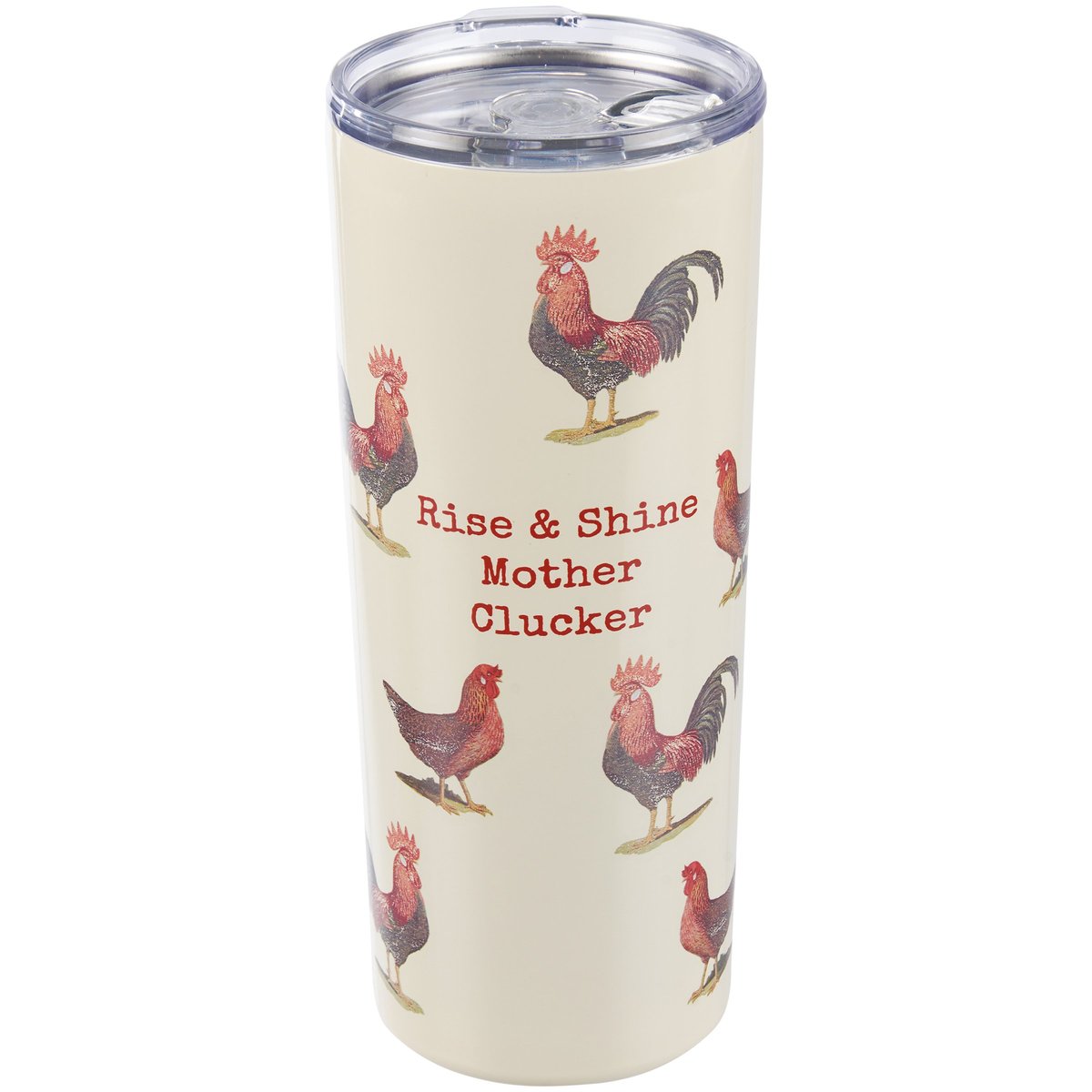 A 20 oz stainless steel coffee tumbler from our Farmhouse Collection displaying a full wrap-around design of roosters and chickens in a vintage style. Design features a coordinating punny sentiment that reads "Rise & Shine Mother Clucker." Our Rise And Shine coffee tumbler is insulated to keep beverages hot for 4 hours or cold for 6 hours and includes a plastic lid with rubber seal. Hand-wash only; do not microwave. BPA free. A fun everyday accessory perfect for on-the-go or at home.