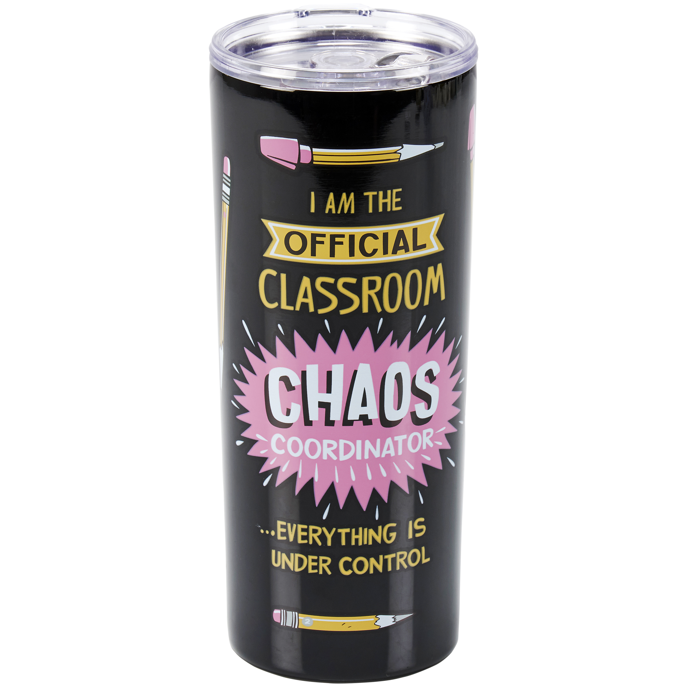 A 20 oz stainless steel coffee tumbler from our Teacher Collection displaying a hand illustrated design of pencils with erasers and a teacher-themed sentiment that reads "I Am The Official Classroom Chaos Coordinator - Everything Is Under Control." Our The Official coffee tumbler is insulated to keep beverages hot for 4 hours or cold for 6 hours and includes a plastic lid with rubber seal. Hand wash only; do not microwave. BPA free. A fun teacher-themed accessory perfect for on-the-go or at home use.