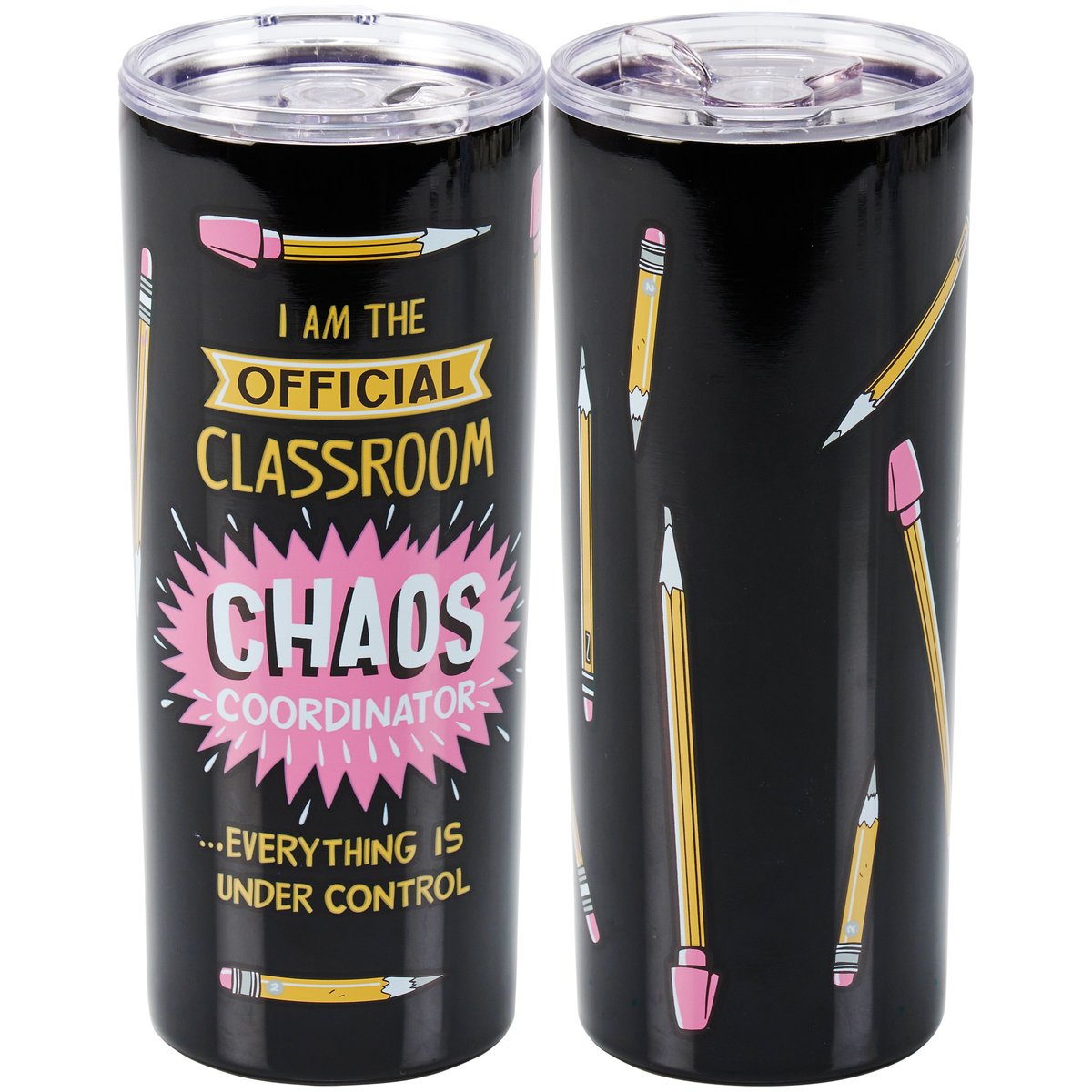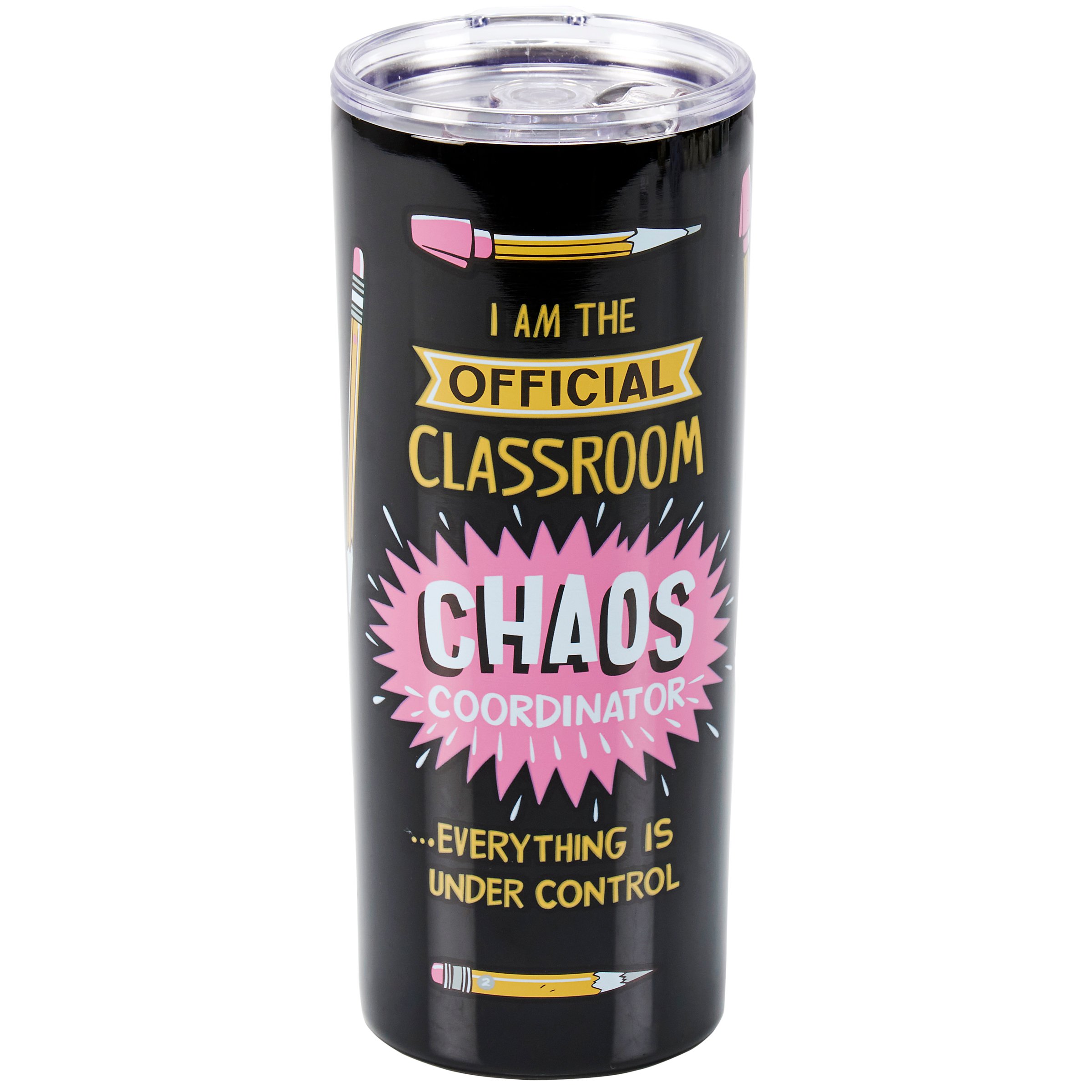 A 20 oz stainless steel coffee tumbler from our Teacher Collection displaying a hand illustrated design of pencils with erasers and a teacher-themed sentiment that reads "I Am The Official Classroom Chaos Coordinator - Everything Is Under Control." Our The Official coffee tumbler is insulated to keep beverages hot for 4 hours or cold for 6 hours and includes a plastic lid with rubber seal. Hand wash only; do not microwave. BPA free. A fun teacher-themed accessory perfect for on-the-go or at home use.