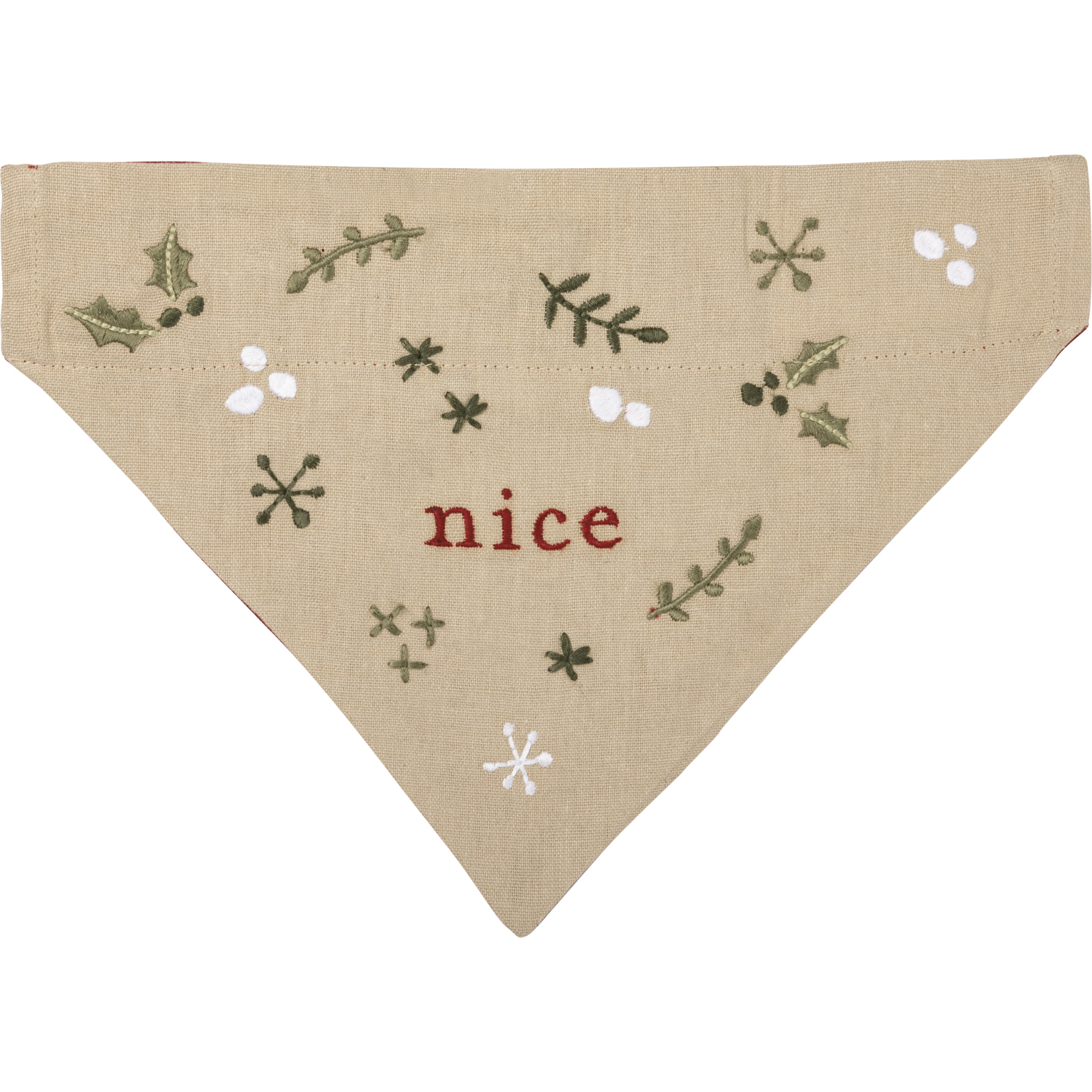 A large reversible cotton linen blend collar bandana. Features an embroidered "Naughty" sentiment and holiday botanical designs on one side, and "Nice" sentiment with holiday botanical designs on the other. Bandana easily slides around standard collars to easily change designs. Machine-washable.