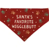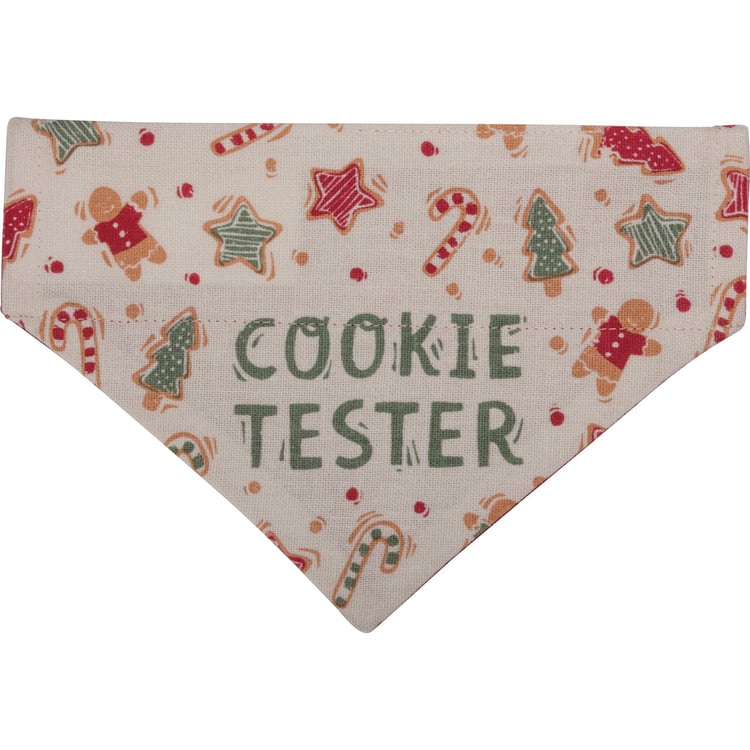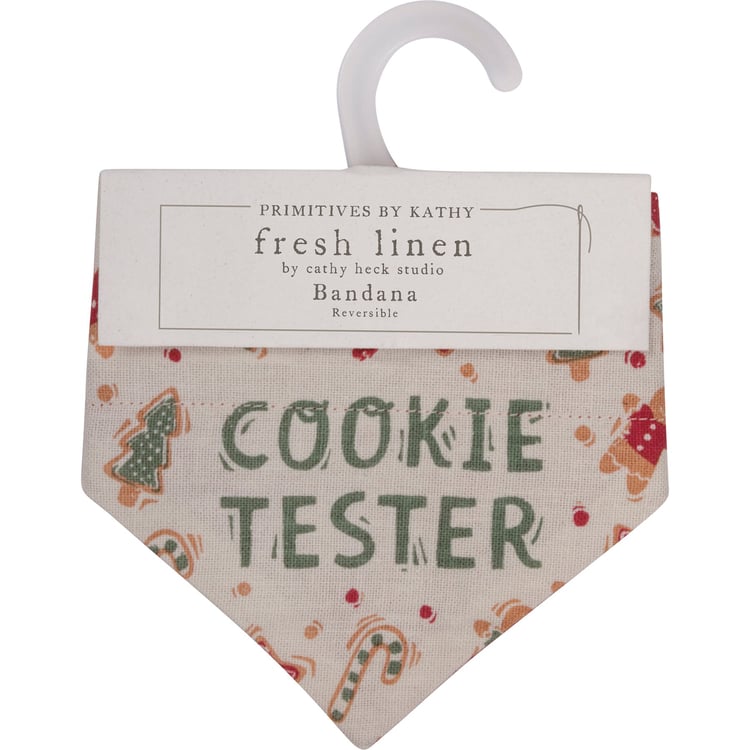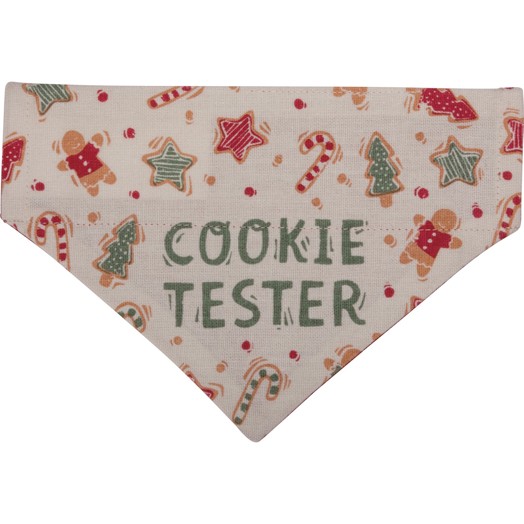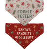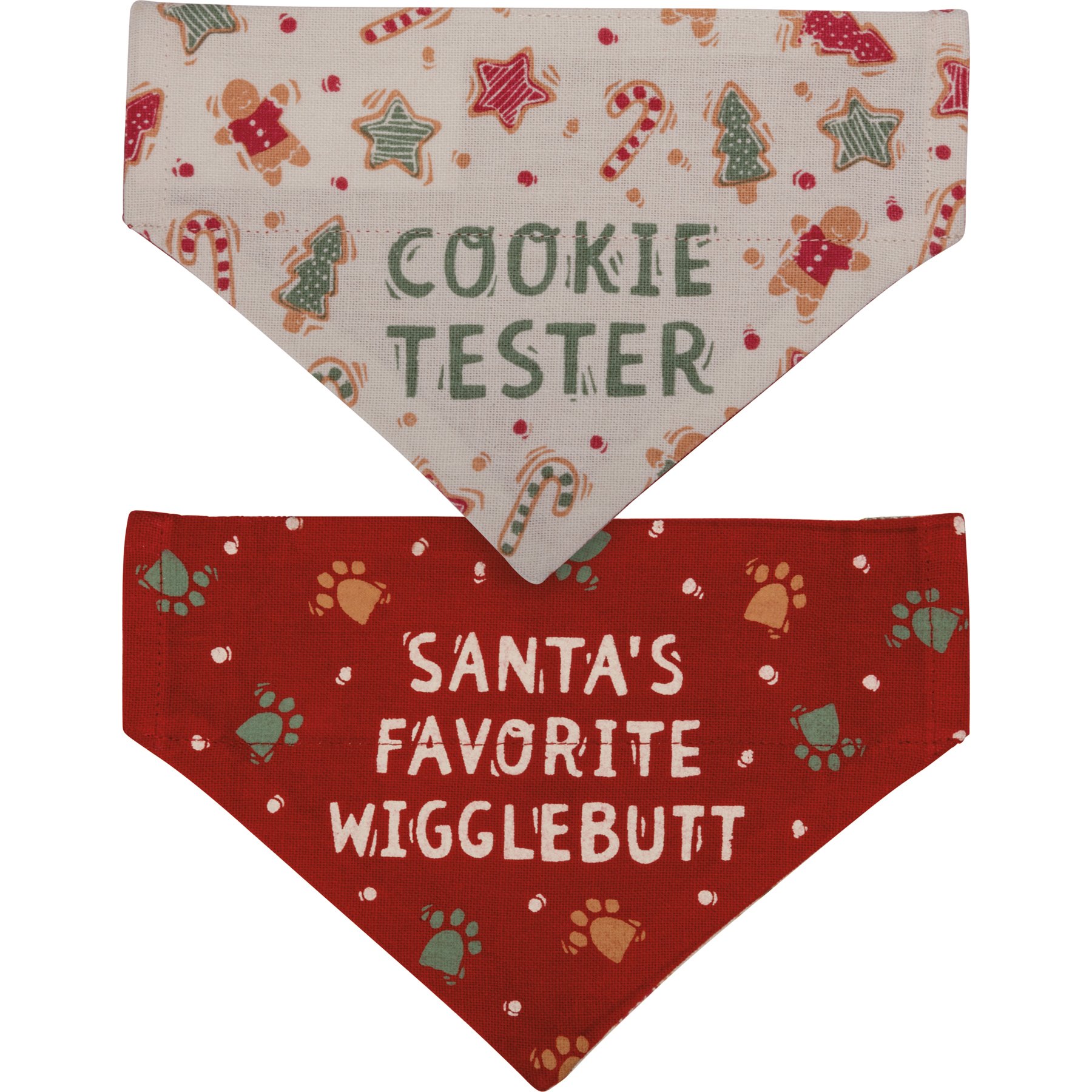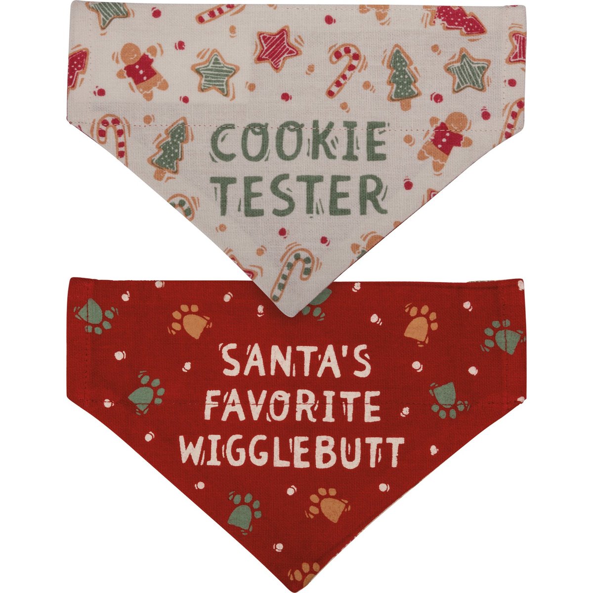 A small reversible cotton linen blend collar bandana. Features a "Cookie Tester" sentiment and cookie designs on one side, and "Santa's Favorite Wigglebutt" sentiment with paw print designs on the other. Bandana easily slides around standard collars to easily change designs. Machine-washable.