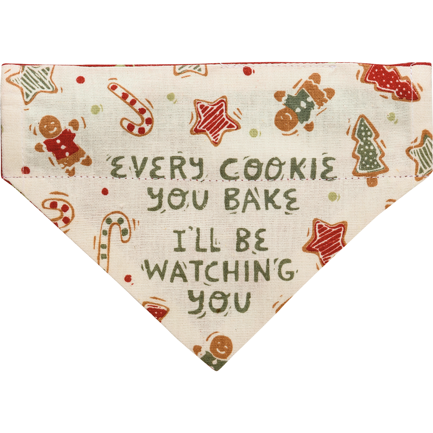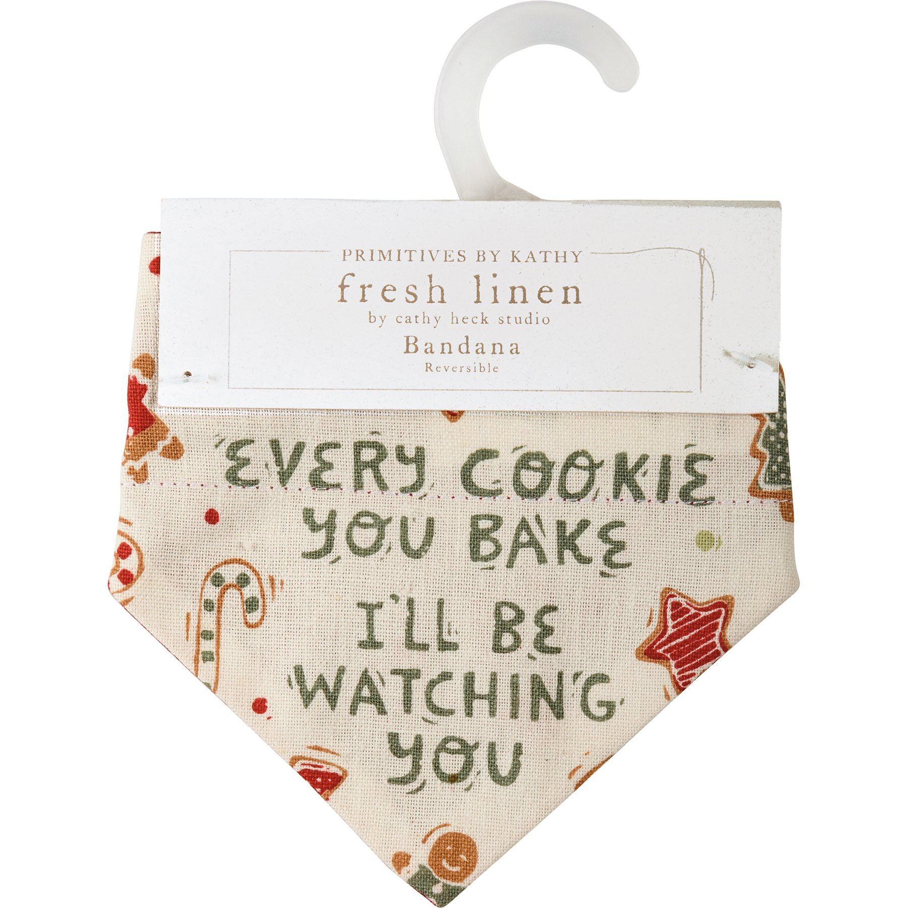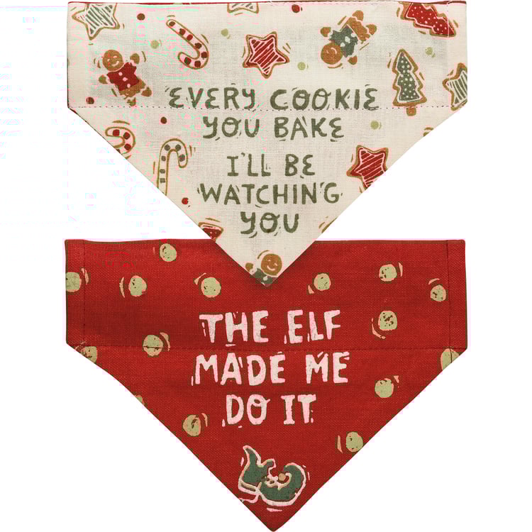 A small reversible cotton linen blend collar bandana. Features "Every Cookie You Bake I'll Be Watching You" sentiment and Christmas cookie designs on one side, and "The Elf Made Me Do It" sentiment with elf shoe and polka dot designs on the other. Bandana slides around standard collars to easily change designs. Machine-washable.