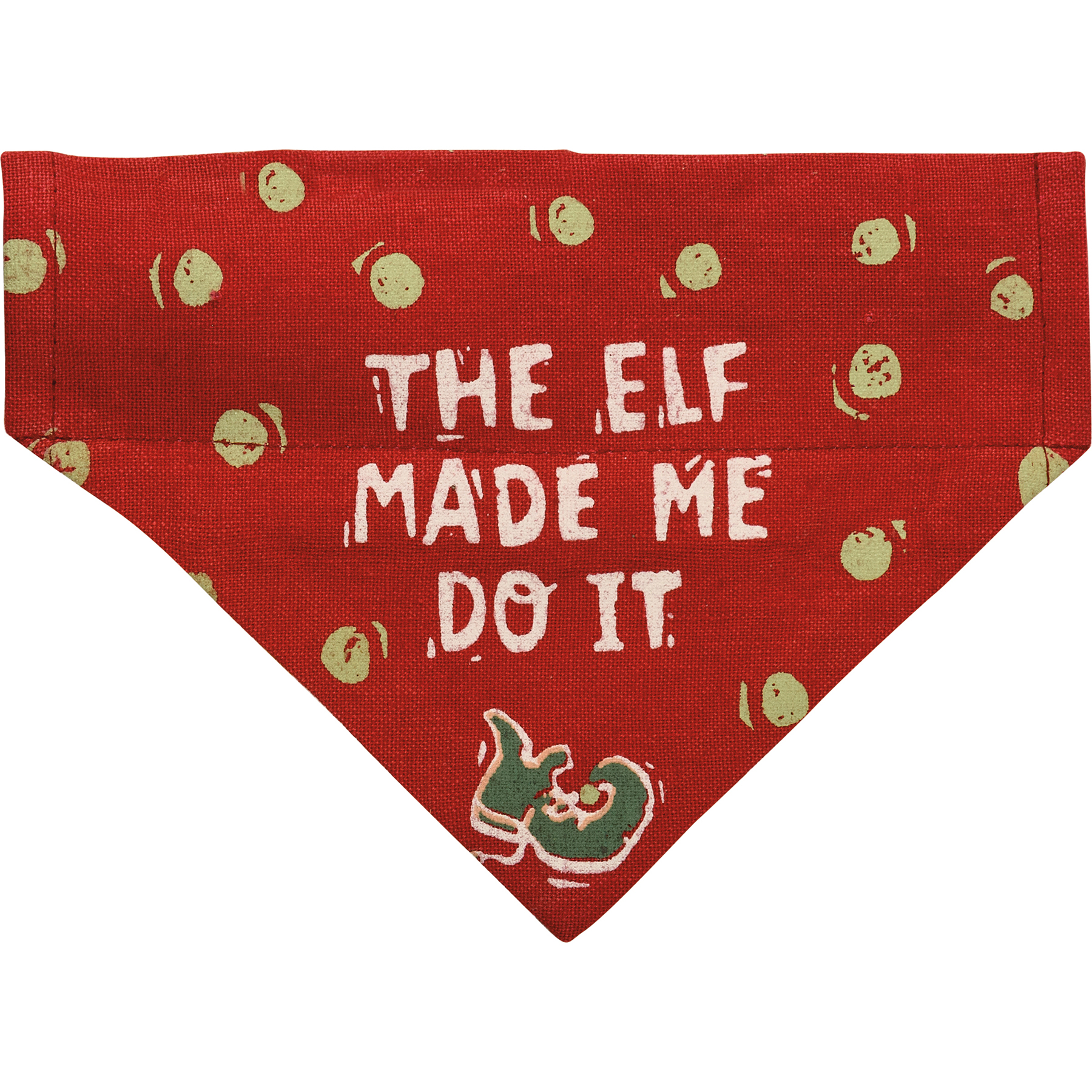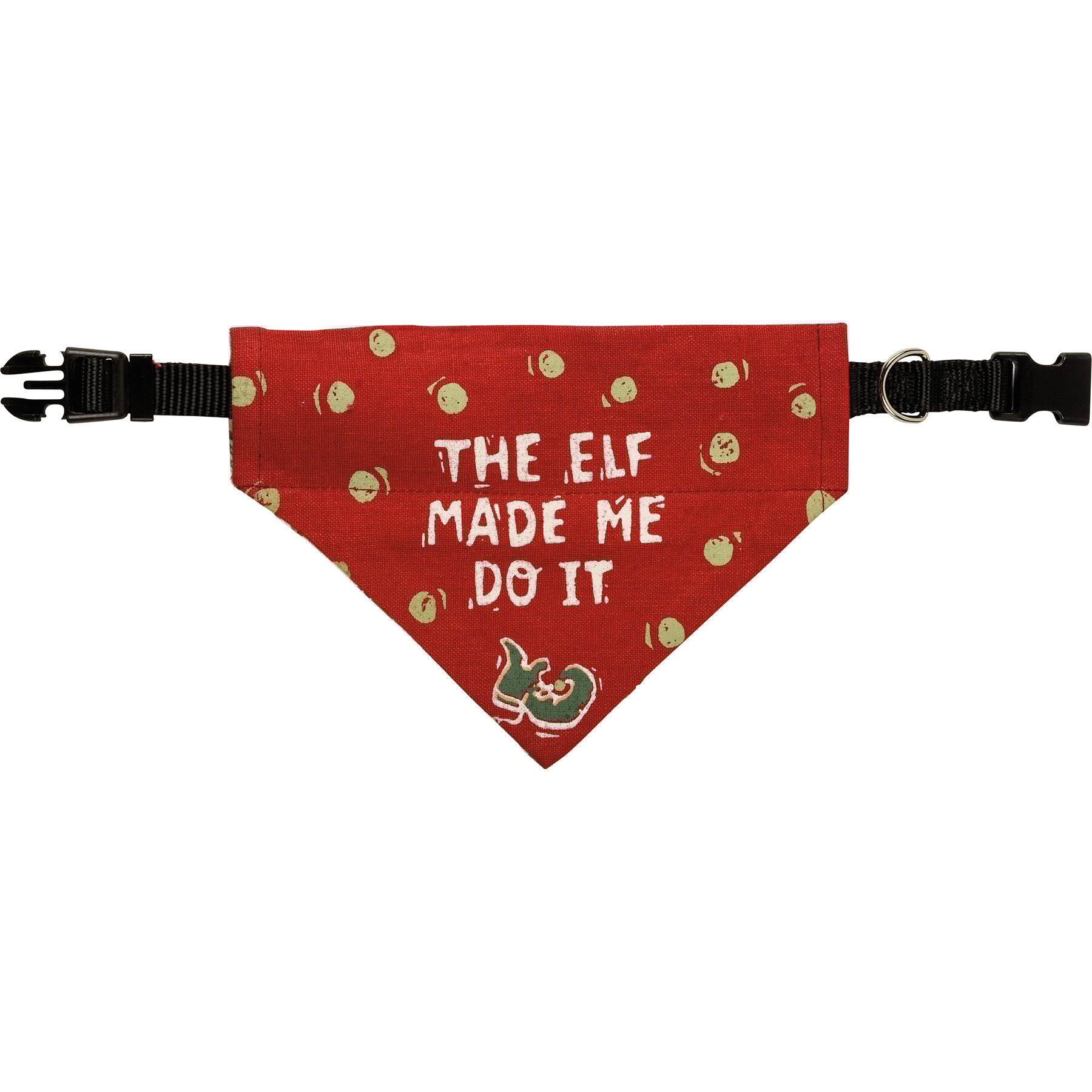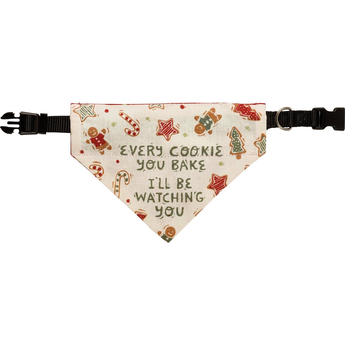 A small reversible cotton linen blend collar bandana. Features "Every Cookie You Bake I'll Be Watching You" sentiment and Christmas cookie designs on one side, and "The Elf Made Me Do It" sentiment with elf shoe and polka dot designs on the other. Bandana slides around standard collars to easily change designs. Machine-washable.
