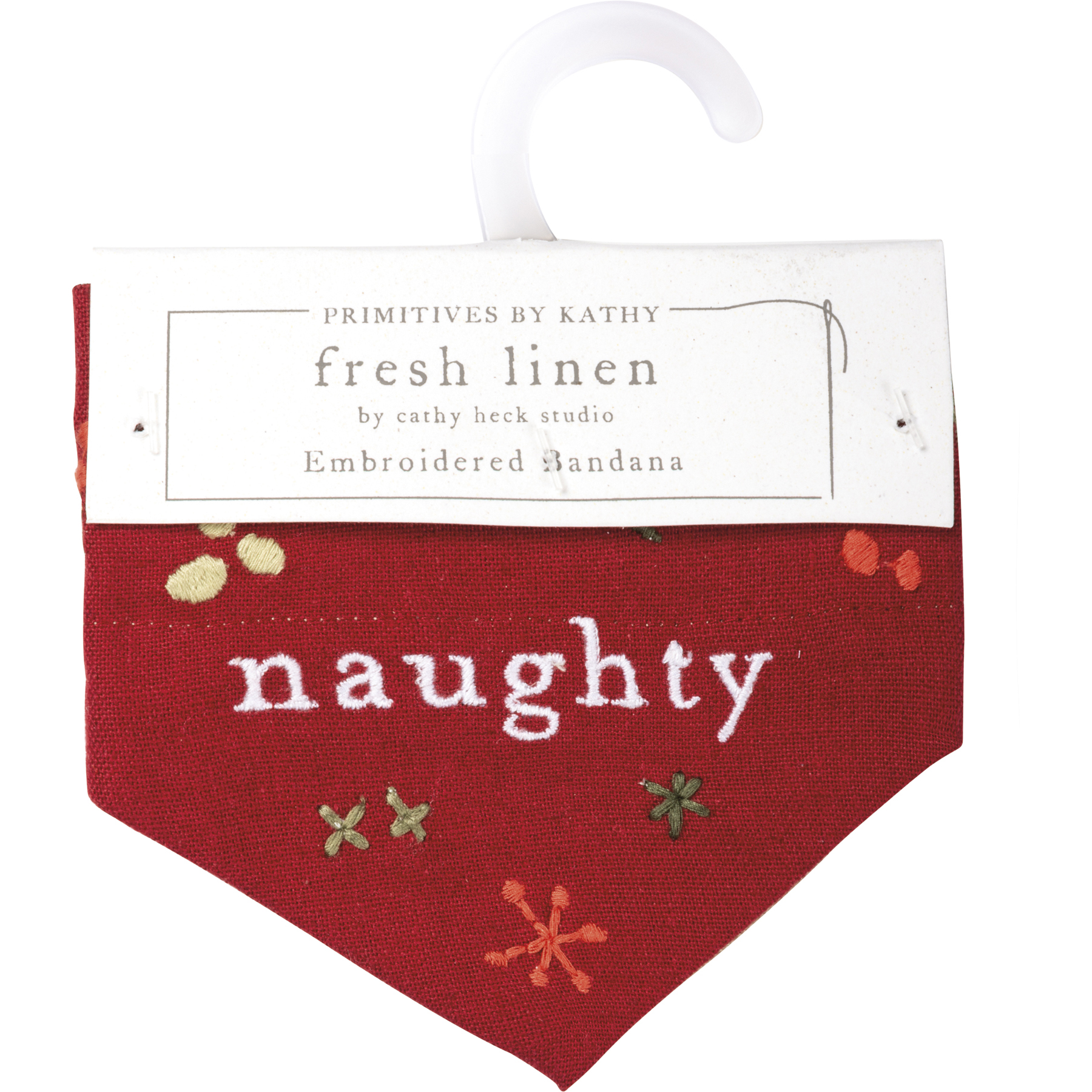 A small reversible cotton linen blend collar bandana. Features an embroidered "Naughty" sentiment and holiday botanical designs on one side, and "Nice" sentiment with holiday botanical designs on the other. Bandana easily slides around standard collars to easily change designs. Machine-washable.