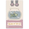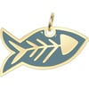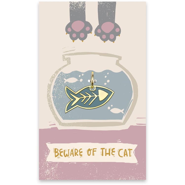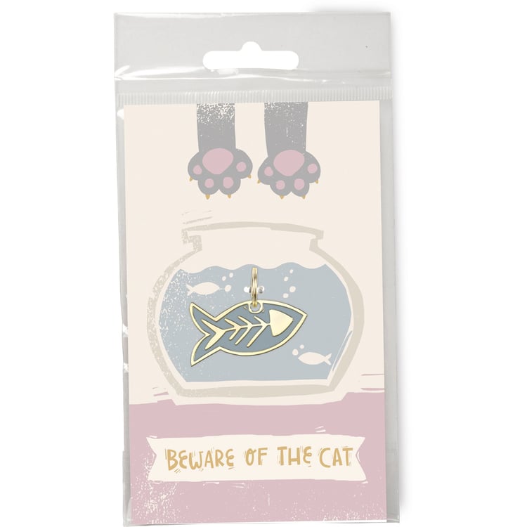 A high quality, hard enamel pet charm featuring a fish shape. Includes gold metal split ring to attach to a collar. Comes attached to a decorative cat-themed backer card.