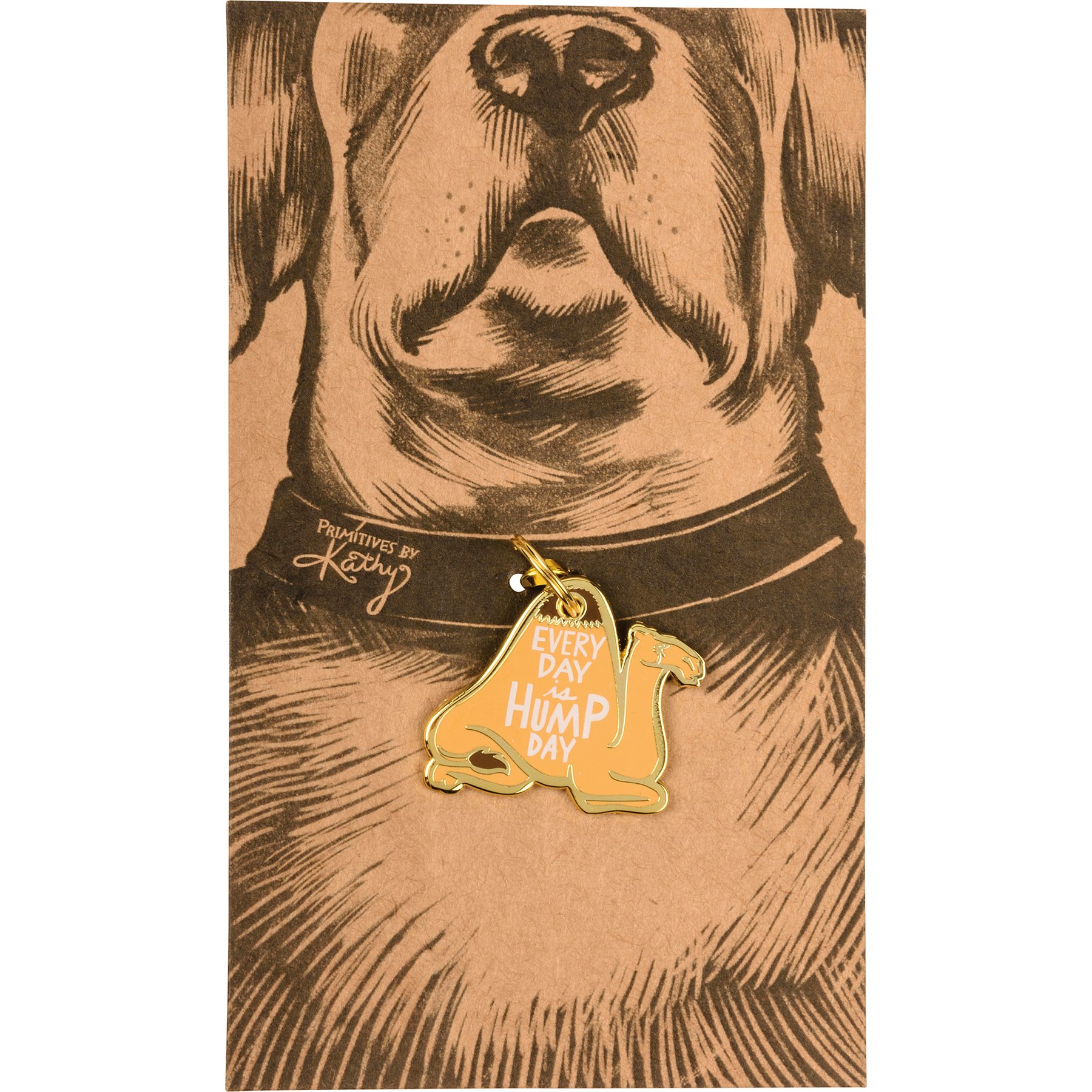 A high-quality, hard enamel collar charm featuring an "Every Day Is Hump Day" sentiment with an original, hand-illustrated camel design to add playful personality! Charm is attached to an illustrated dog backer card in plastic bag for easy hanging. Back of charm is safe to be engraved without damaging front enamel.