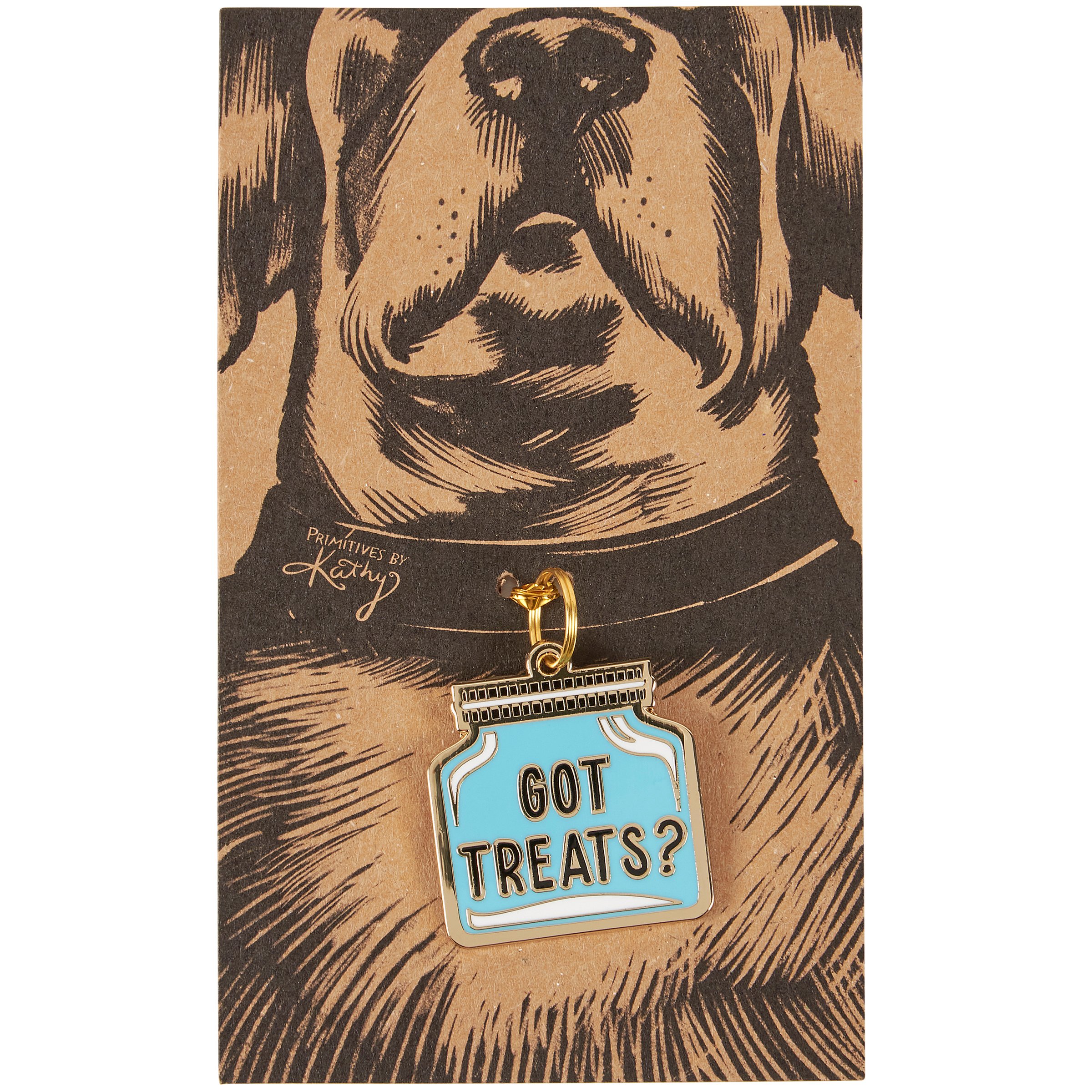 A high-quality, hard enamel collar charm from our Pet Collection in the shape of the displayed jar design with a fun pet-themed sentiment that reads "Got Treats?" and gold accents to add playful personality! Our Got Treats collar charm is attached to an illustrated dog backer card inside a plastic bag making it great for gifting. Back of collar charm is safe to engrave without damaging front enamel. A fun pet accessory perfect for everyday use.