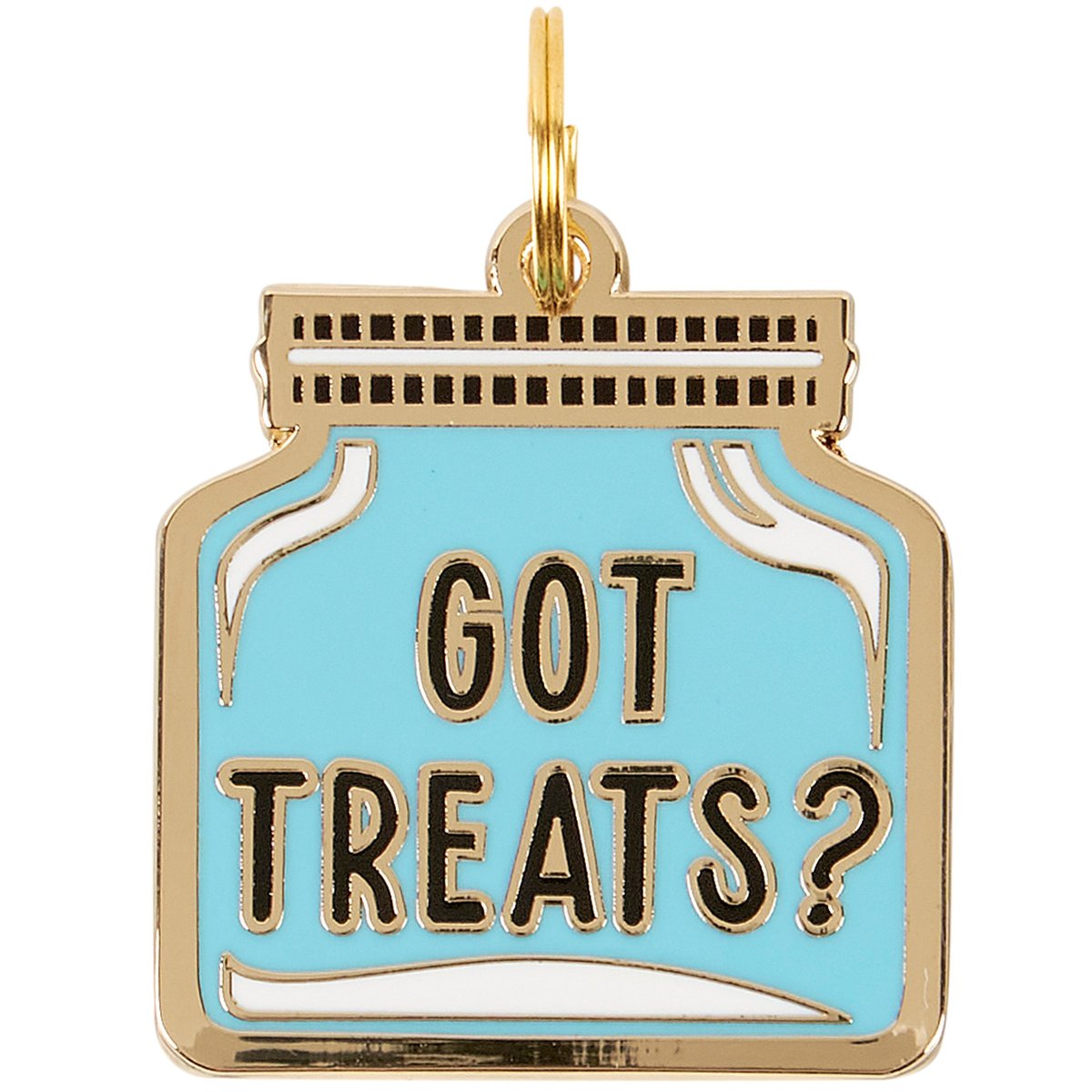 A high-quality, hard enamel collar charm from our Pet Collection in the shape of the displayed jar design with a fun pet-themed sentiment that reads "Got Treats?" and gold accents to add playful personality! Our Got Treats collar charm is attached to an illustrated dog backer card inside a plastic bag making it great for gifting. Back of collar charm is safe to engrave without damaging front enamel. A fun pet accessory perfect for everyday use.