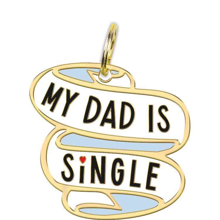 A high quality, hard enamel pet charm lending a "My Dad Is Single" sentiment. Features gold metal split ring to attach to a collar. Comes attached to a dog backer card.