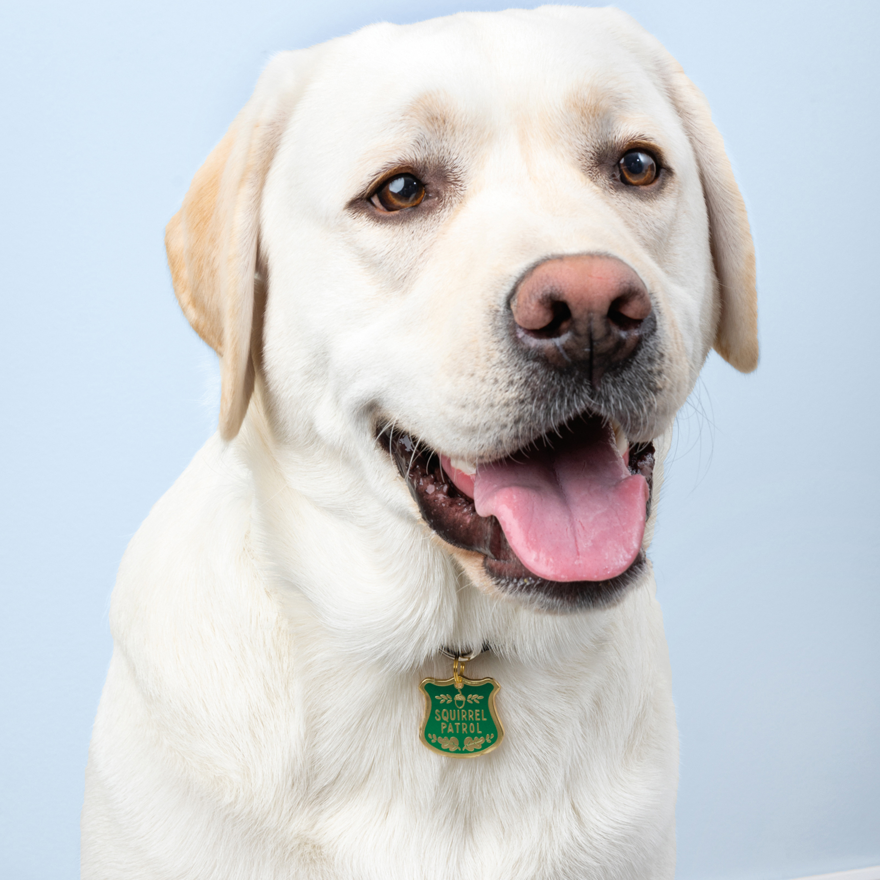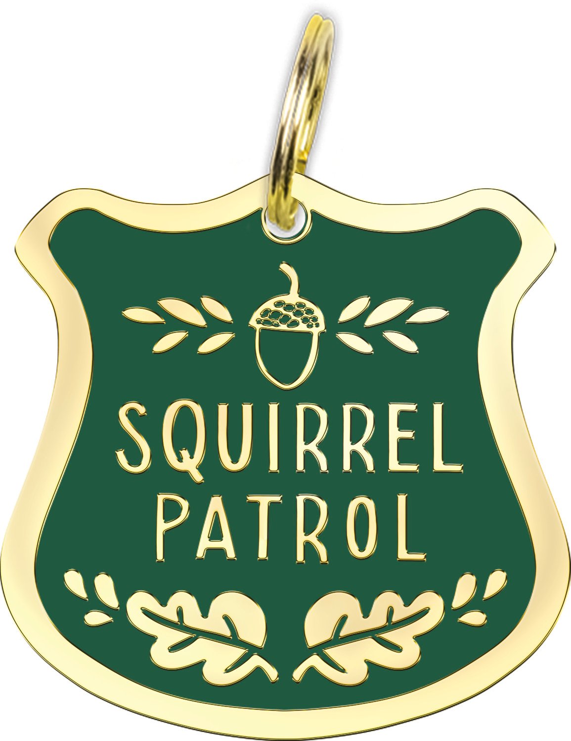 A high quality, hard enamel pet charm lending a "Squirrel Patrol" sentiment. Features gold metal split ring to attach to a collar. Our Squirrel Patrol dog tag collar charm comes attached to a dog backer card. Part of our best-selling Pet Collection.