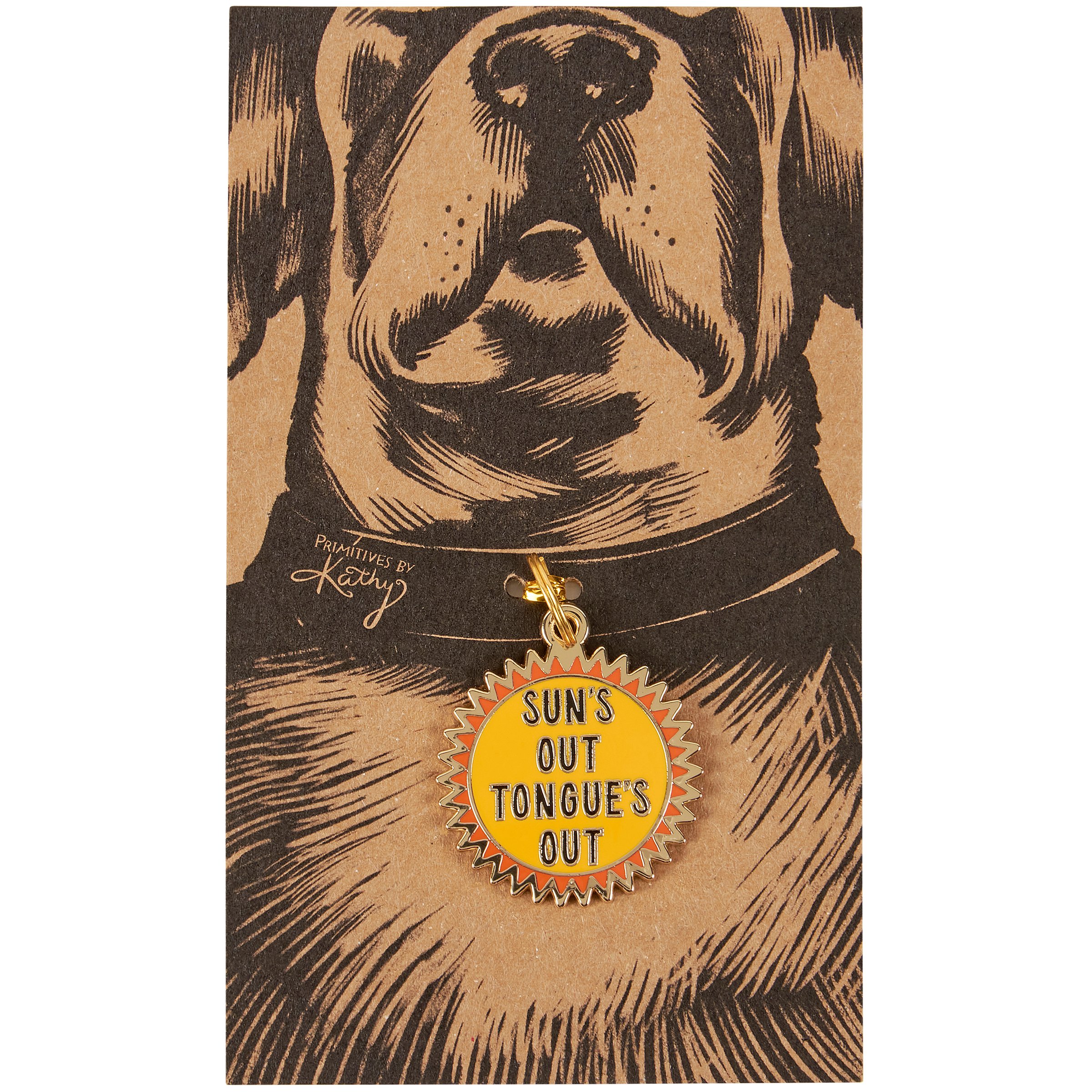 A high-quality, hard enamel collar charm from our Pet Collection in the shape of the displayed sun design with a fun pet-themed sentiment that reads "Sun's Out Tongue's Out" and gold accents to add playful personality! Our Tongue's Out collar charm is attached to an illustrated dog backer card inside a plastic bag making it great for gifting. Back of collar charm is safe to engrave without damaging front enamel. A fun pet accessory perfect for everyday use.