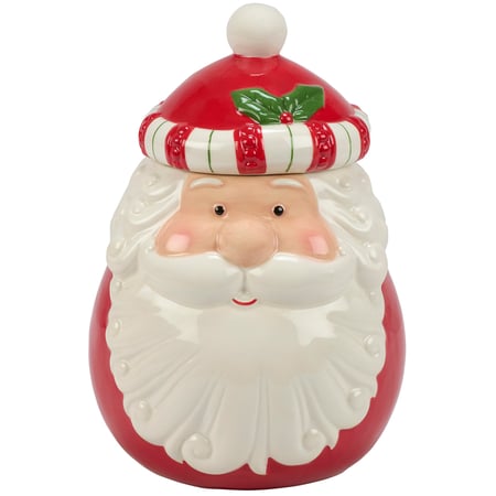 A ceramic cookie jar from our Christmas Collection displaying a fun jolly Santa design. Seasonal cookie jar design features colorful glaze finish with sculpted details throughout and Santa hat design for the lid. Hand wash only. Our Jolly Santa cookie jar is a fun Santa-themed kitchen accessory perfect for storing holiday treats.