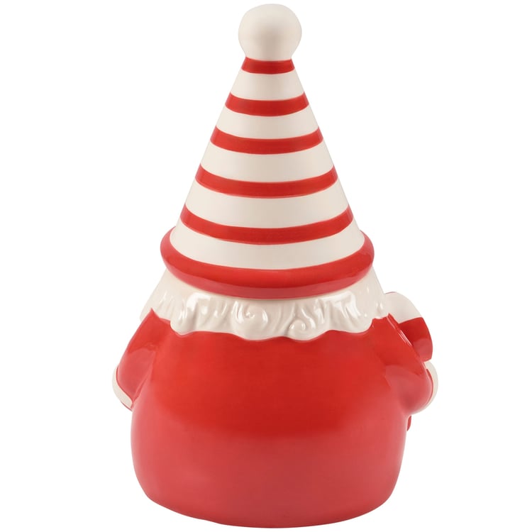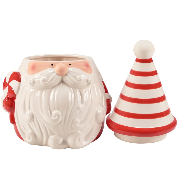 A ceramic cookie jar from our Christmas Collection displaying a fun Nordic inspired Santa sculpt. Seasonal cookie jar design features glossy glaze finish and striped Santa hat design for the lid. Our Nordic Santa cookie jar is conveniently dishwasher and food safe for easy use. A fun Santa-themed kitchen accessory perfect for storing holiday treats.