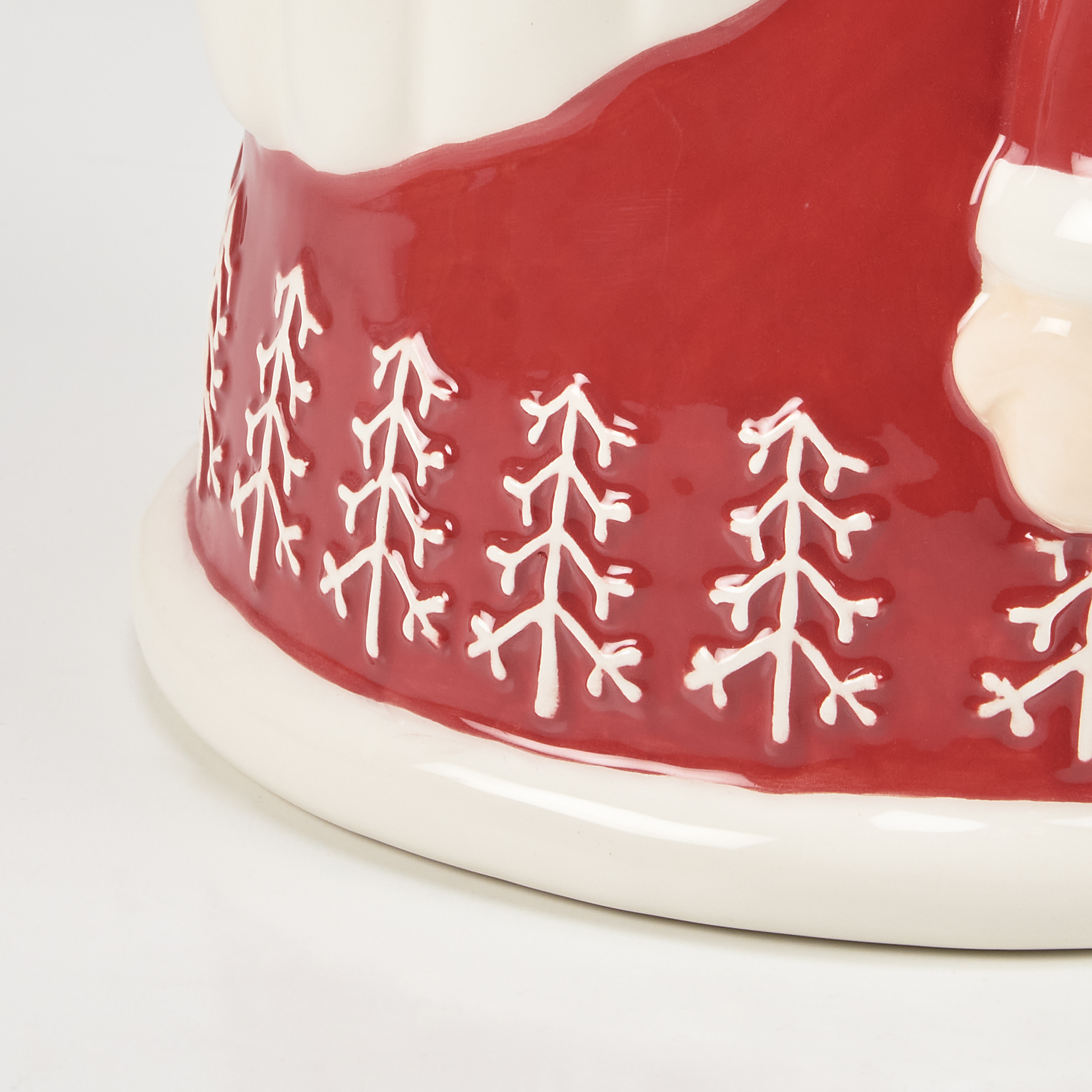 A ceramic treat jar from our Christmas Collection displaying a fun Santa sculpt. Seasonal treat jar design features colorful glaze finish with embossed Nordic tree designs and a Santa hat design for the lid. Our Santa Claus treat jar is conveniently microwave, dishwasher, and food safe for easy use. A fun Santa-themed kitchen accessory perfect for storing holiday treats.
