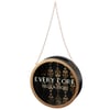 A decorative wine cork holder from our Art Deco Collection featuring an art deco inspired design on a round wooden frame with metallic gold accents and a glass window displaying a wine-themed sentiment that reads "Every Cork Tells A Story." Cork holder can be displayed on wall using the attached metal chain hanger. Our Every Cork Tells A Story cork holder includes a top opening to drop corks in and view them through front window. A stylish wine-themed gift to display keepsakes as everyday home décor.