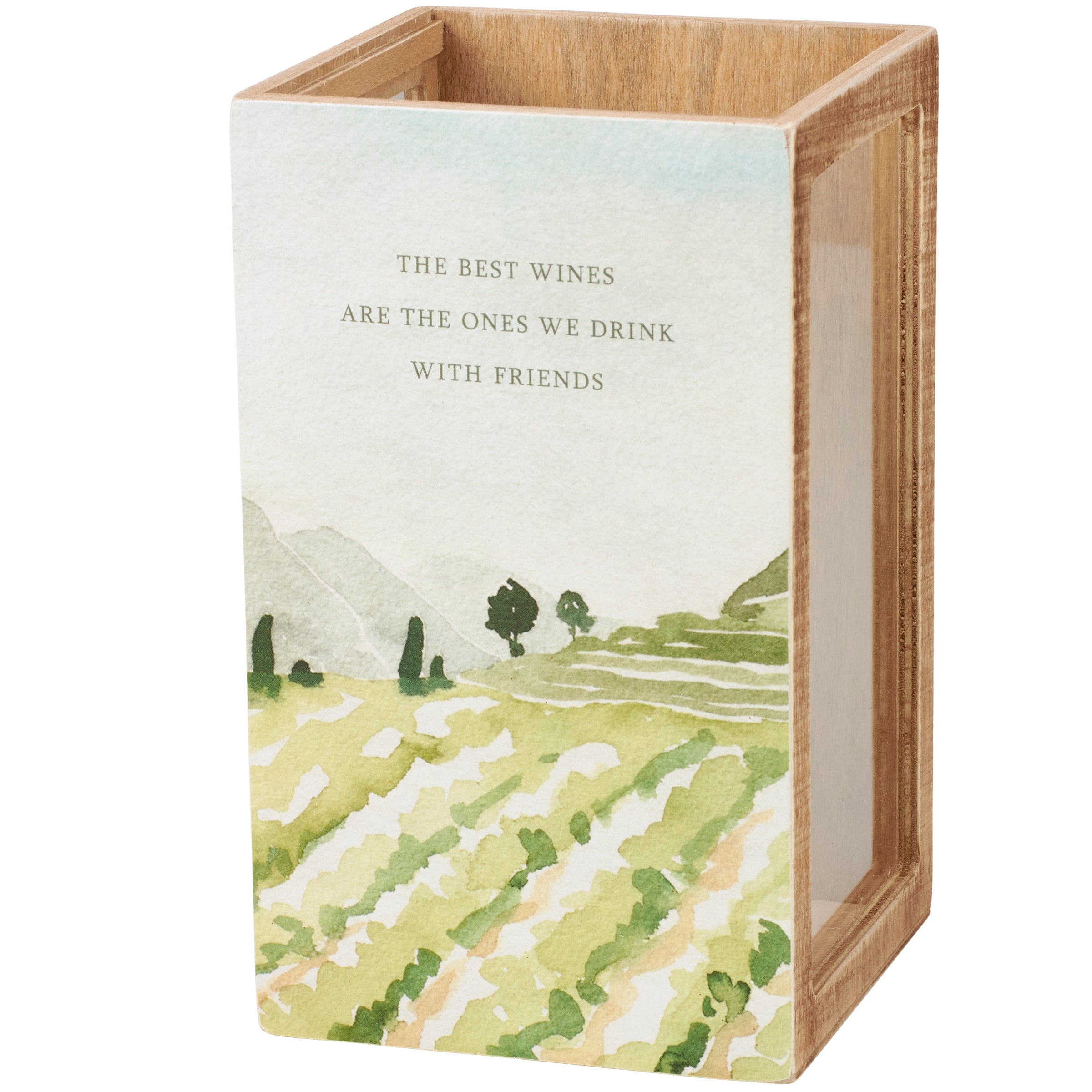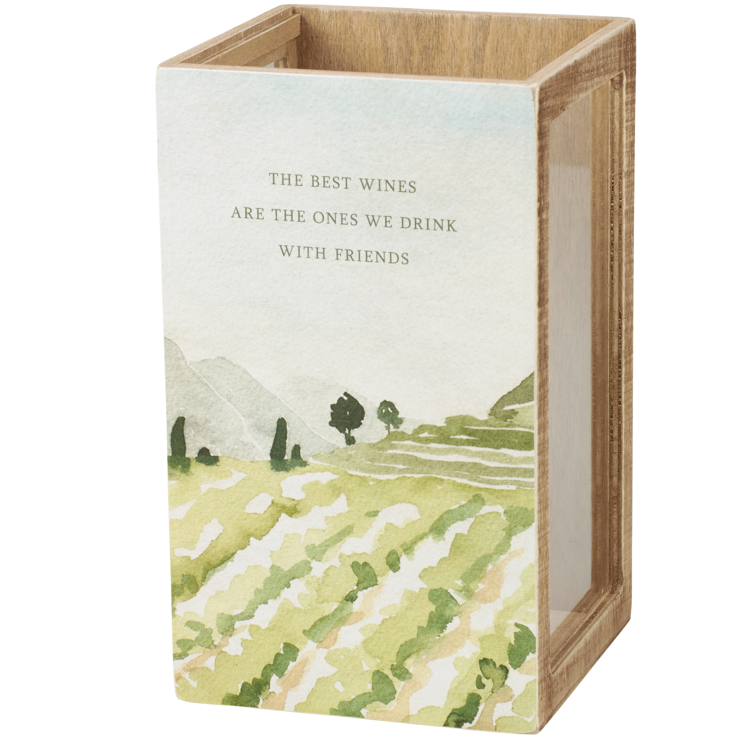 A double-sided cork holder from our Alcohol Collection featuring two display options of hand painted designs in a watercolor style with glass windows on the sides to view corks stored inside. Cork holder displays a wine bottles design with "Good Friends, Good Wine, Good Times" sentiment on one side and vineyard design with "The Best Wines Are The Ones We Drink With Friends" sentiment on the other side. Our Good Times cork holder can be used to collect used corks or elegantly display a bottle of wine. A lovely home accent with functional style.