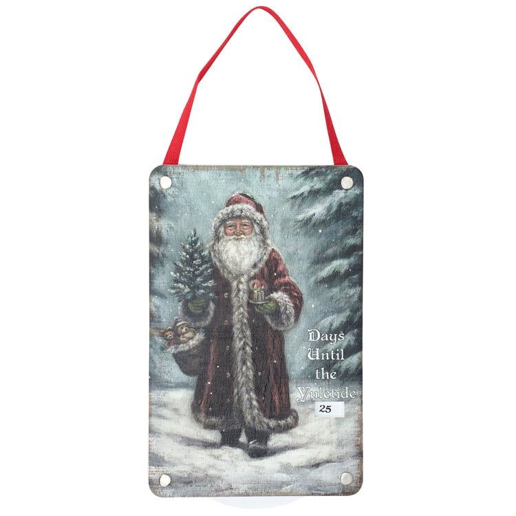 A wooden countdown wheel from our Christmas Collection displaying a winter scene of vintage old world Santa with a number window and a "Days Until The Yuletide" sentiment above it. Vintage Santa design is replicated from original artwork painted onto burlap canvas, giving the art a unique depth and texture. Build excitement for the holidays using the wheel on the bottom to rotate the days left until Christmas. Our Yuletide countdown wheel is ready to hang for display via the attached red cotton tape hanger. A rustic Christmas home accent that can be easily displayed in any home or work space to build excitement for the holidays.