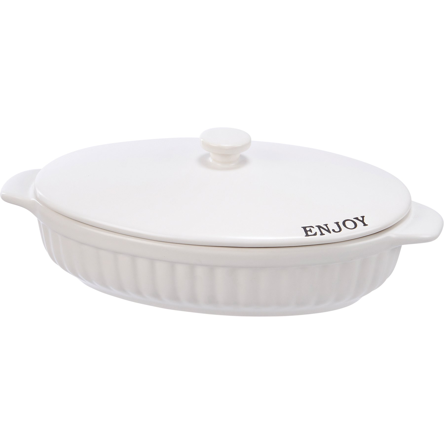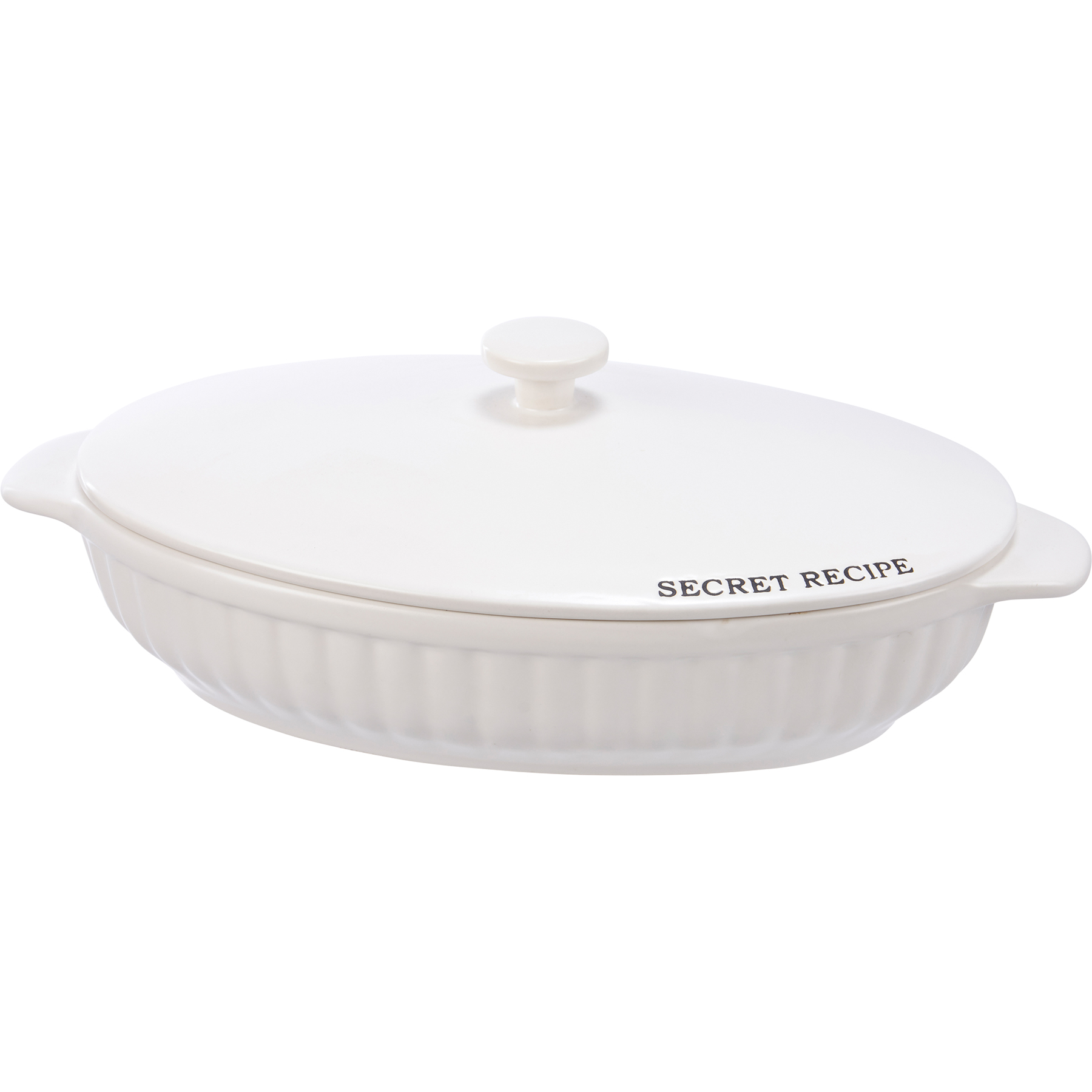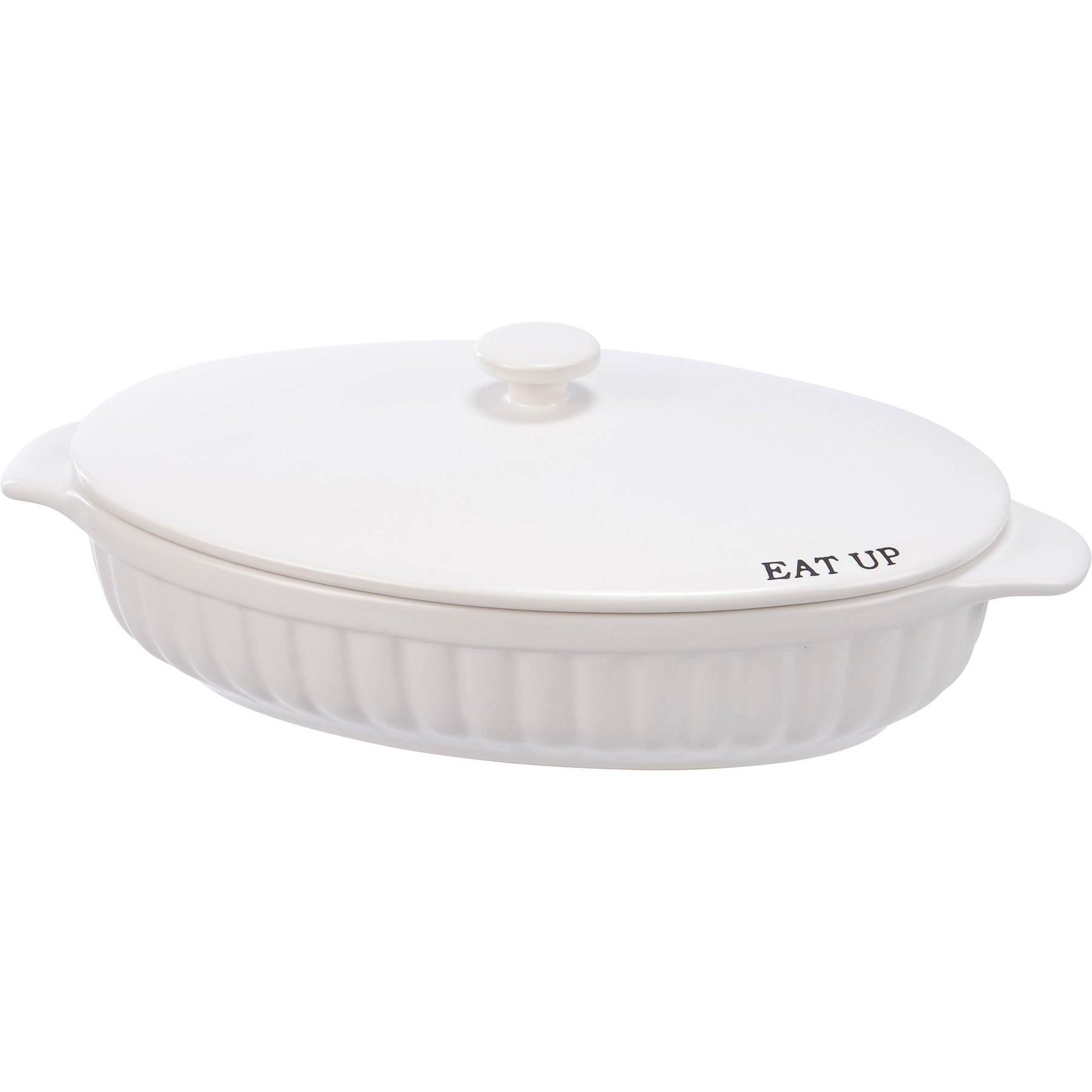 A set of three stoneware covered casserole dishes. Set includes a small, medium, and large dish with debossed "Enjoy," "Eat Up," and "Secret Recipe" sentiments on outside rims of respective stoneware lids. White dishes feature ribbed texture, "More Please" sentiment on the inside bottom of each dish, and rounded handles for easy carrying. Microwave, oven, dishwasher and food safe. This set makes a perfect addition to a farmhouse aesthetic and coordinates well with other pieces in collection!