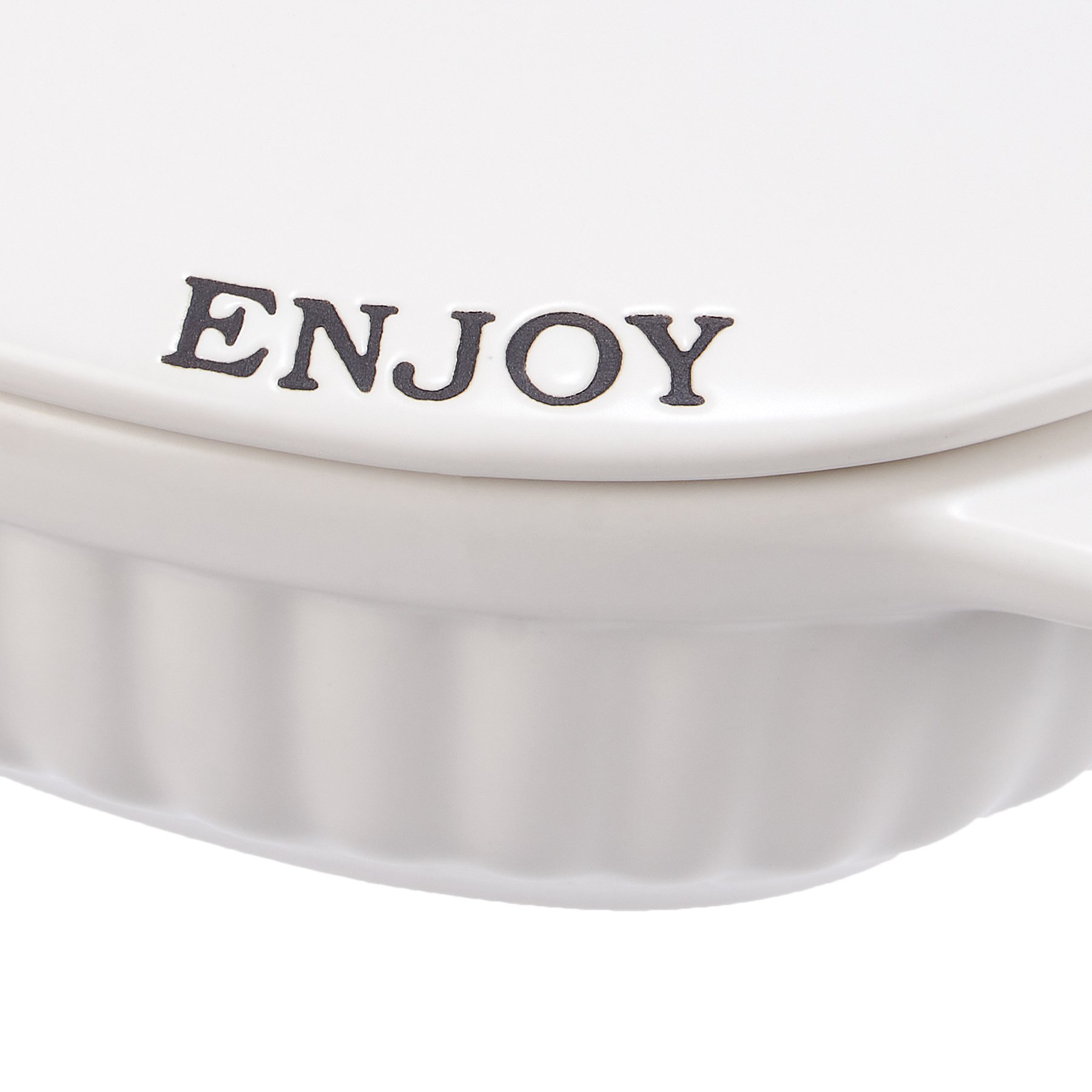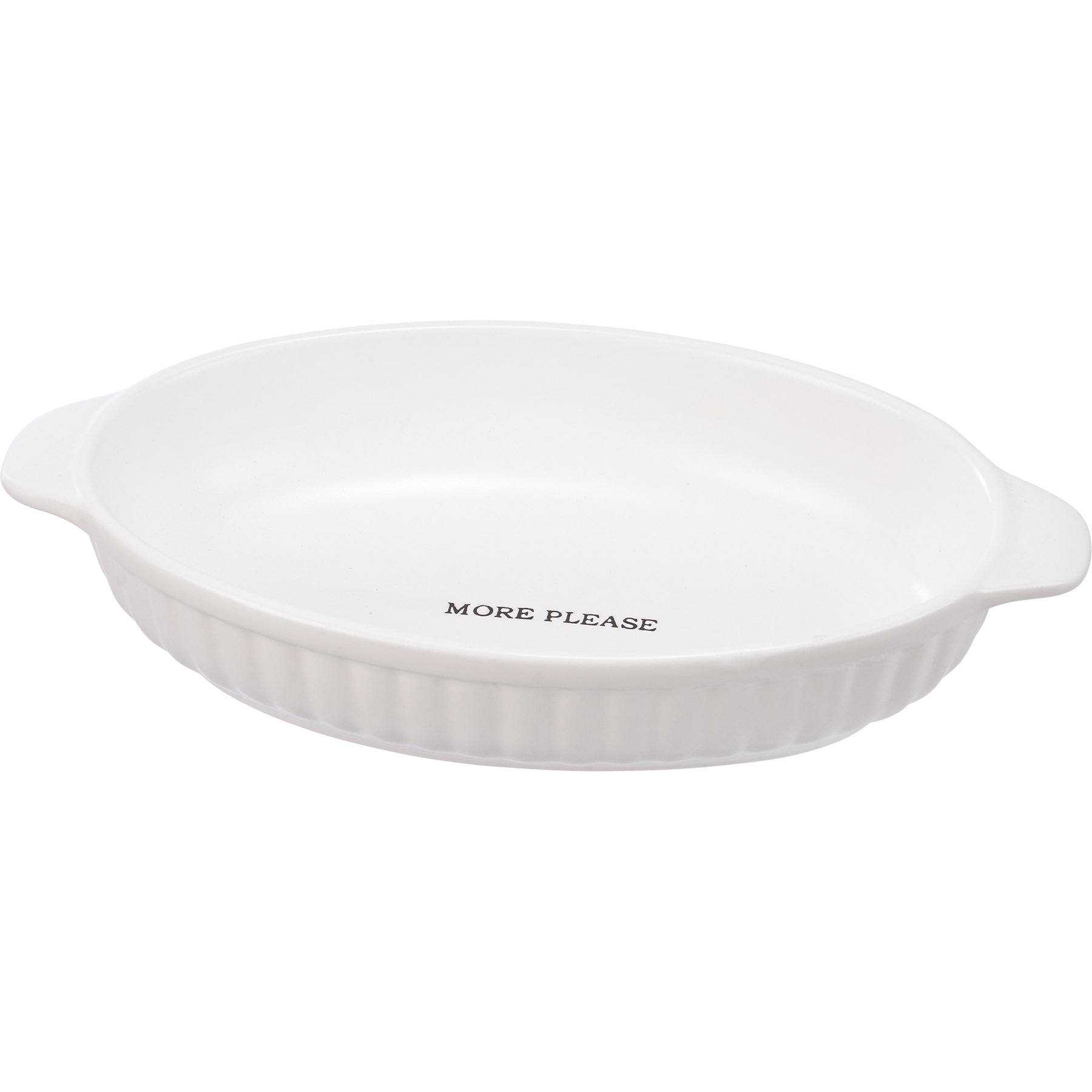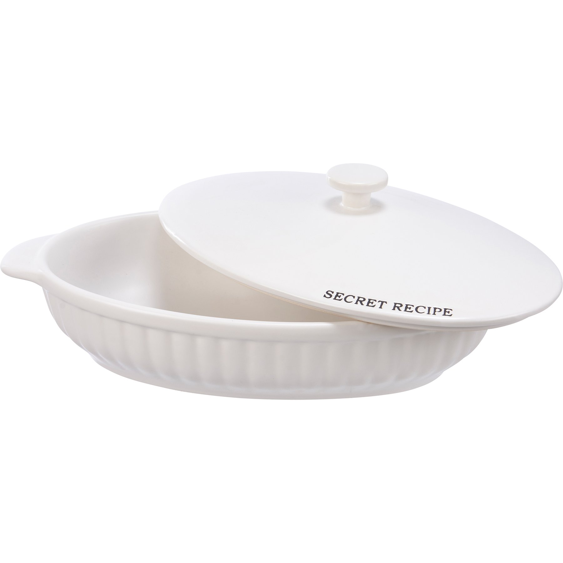 A set of three stoneware covered casserole dishes. Set includes a small, medium, and large dish with debossed "Enjoy," "Eat Up," and "Secret Recipe" sentiments on outside rims of respective stoneware lids. White dishes feature ribbed texture, "More Please" sentiment on the inside bottom of each dish, and rounded handles for easy carrying. Microwave, oven, dishwasher and food safe. This set makes a perfect addition to a farmhouse aesthetic and coordinates well with other pieces in collection!