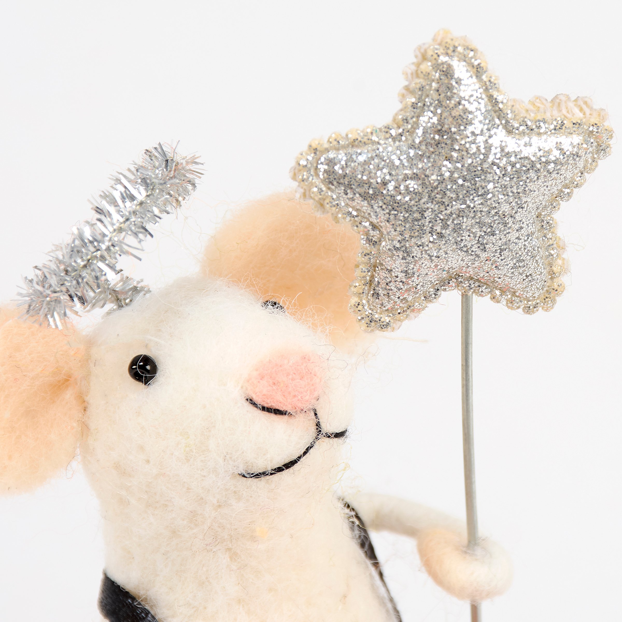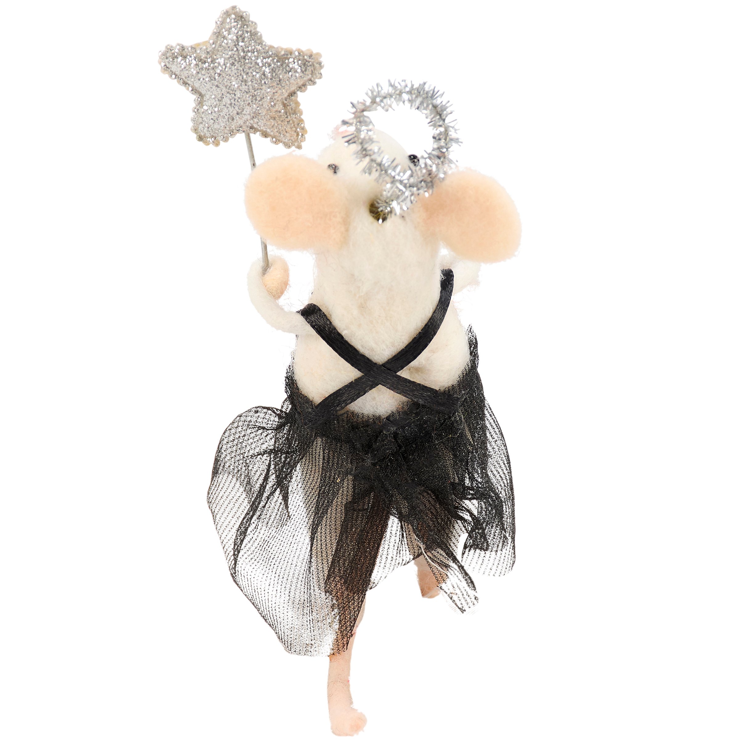 A felt critter from our Halloween Collection displaying a happy mouse with a Halloween costume inspired design wearing an angel costume perfect for adding character to any seasonal display. Halloween mouse critter features cute handmade details including felt treat bucket in one hand and wand accessory in the other with silver glitter details as well as a silver wire halo. Our Angel Mouse critter is designed to free-stand on flat surface for display. Contains small parts; this is not a toy. A fun Halloween home accent that displays well alone or as a collection with other critters.