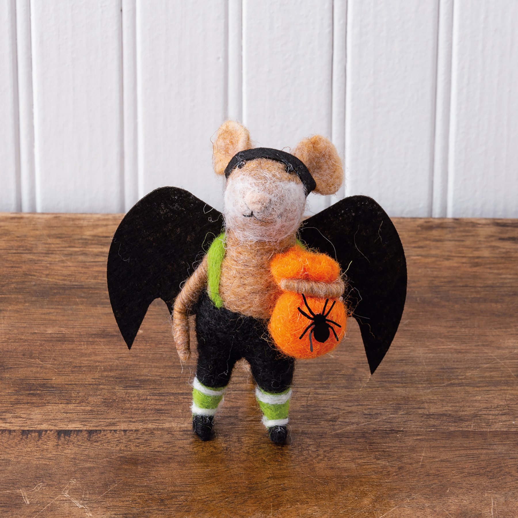 A felt critter featuring a mouse with bat wings carrying an orange sack with a spider on it. Our Bat Mouse critter easily hangs via attached loop and makes a great addition to any Halloween décor. This is not a toy.