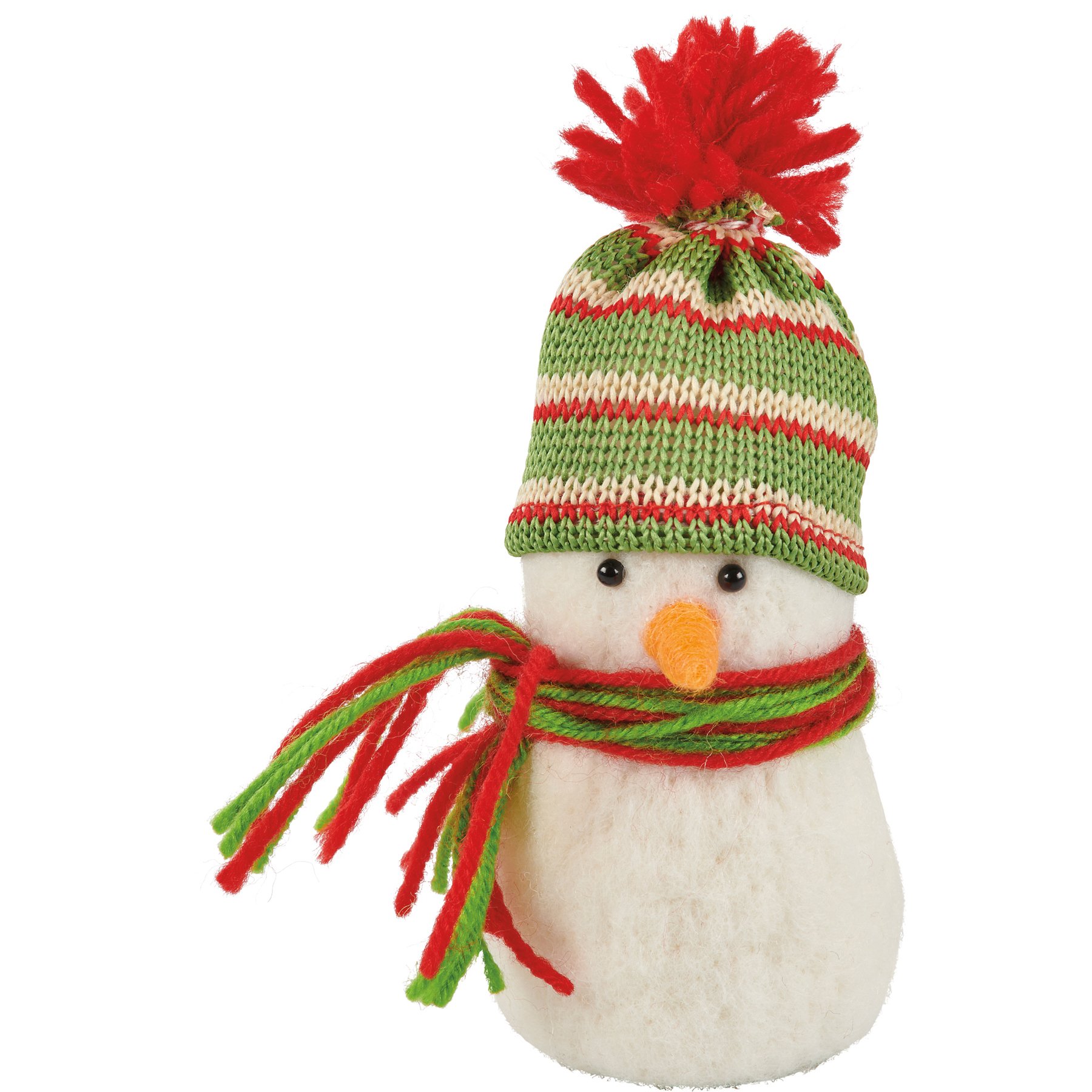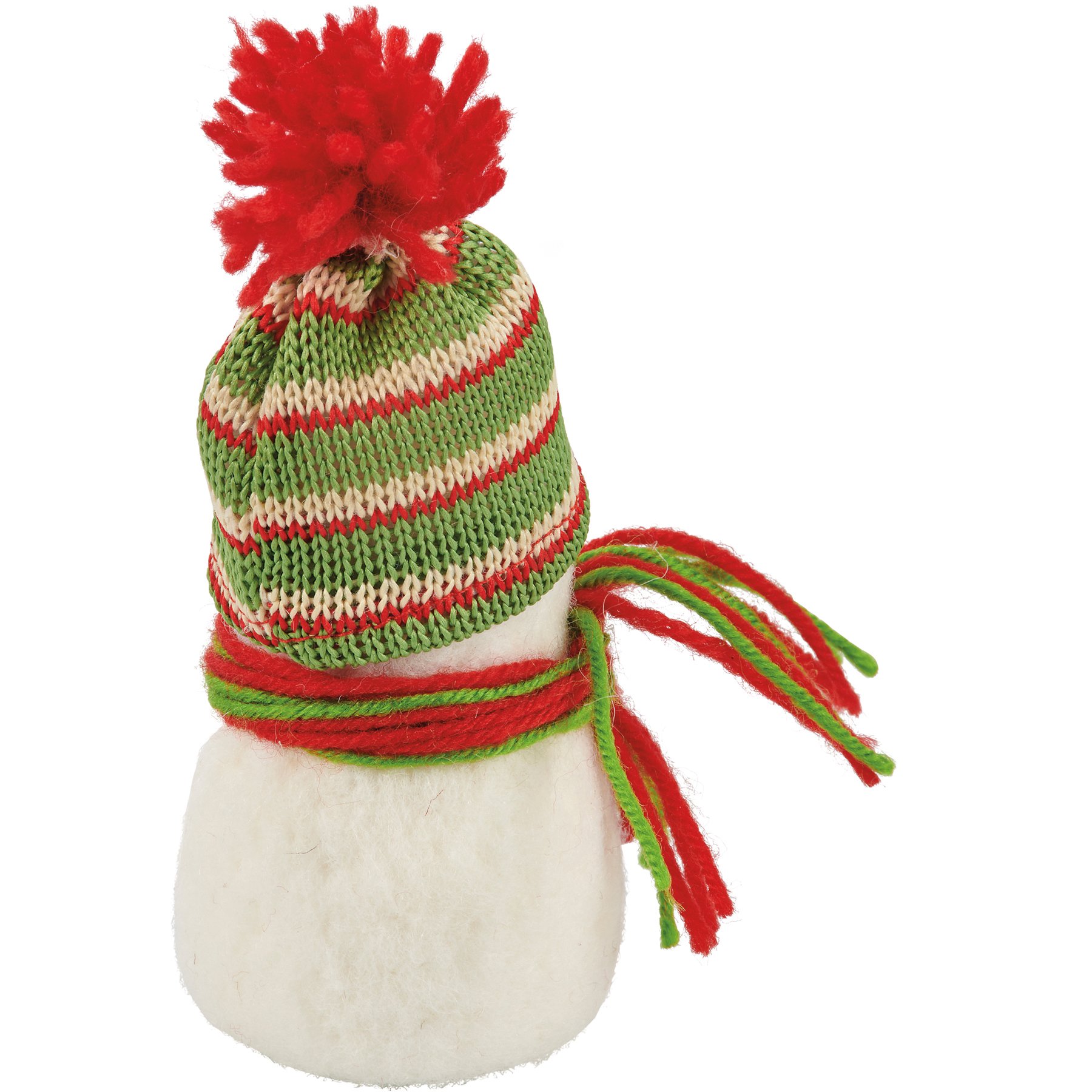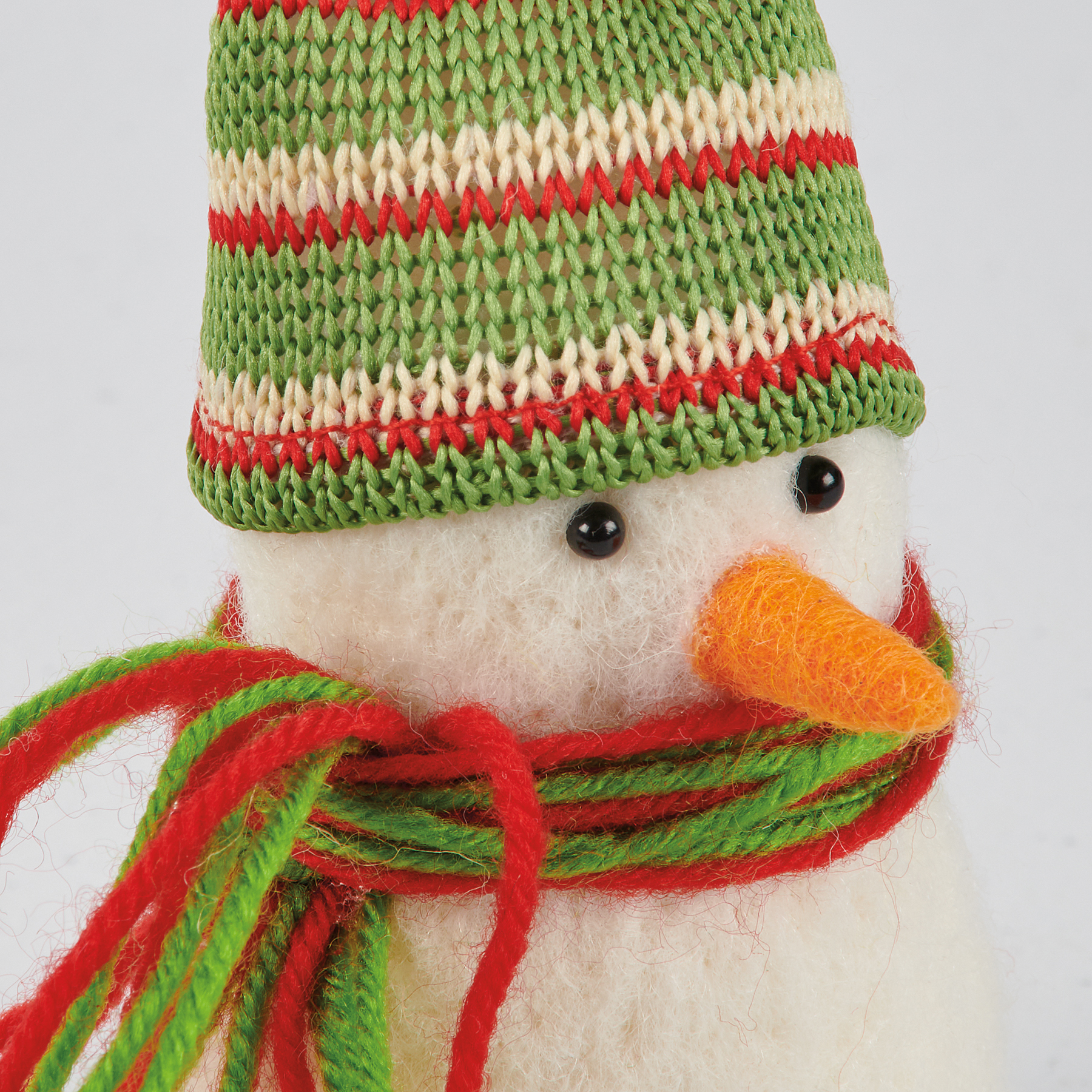 A felt critter from ourĀ Christmas Collection displaying a snowman wearing a knit beanie with red and green yarn as a scarf. Critter features felt and fabric details. Our Beanie Snowman critter is designed to free-stand on flat surface. A cute seasonal home accent to display alone or as a collection with other critters. Contains small parts; this is not a toy.