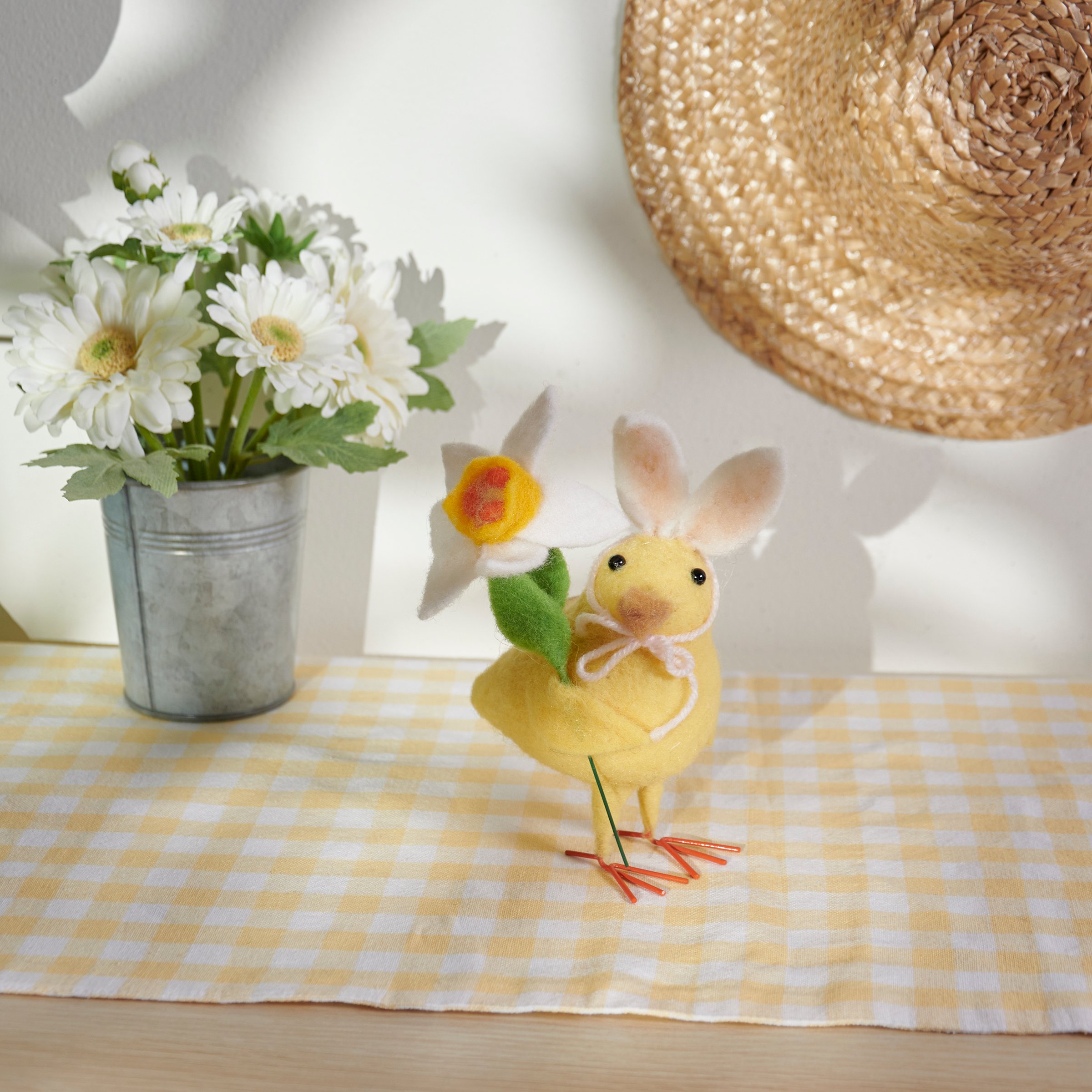A felt critter from our Easter & Spring Collection displaying a chick wearing bunny ears and holding a large flower. Chick critter features cute accents such as wire feet and yarn tie for bunny ears. Our Bunny Ears Chick critter is designed to free-stand on flat surface for display. A cute seasonal home accent to display alone or as a collection with other critters. Contains small parts; this is not a toy.