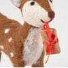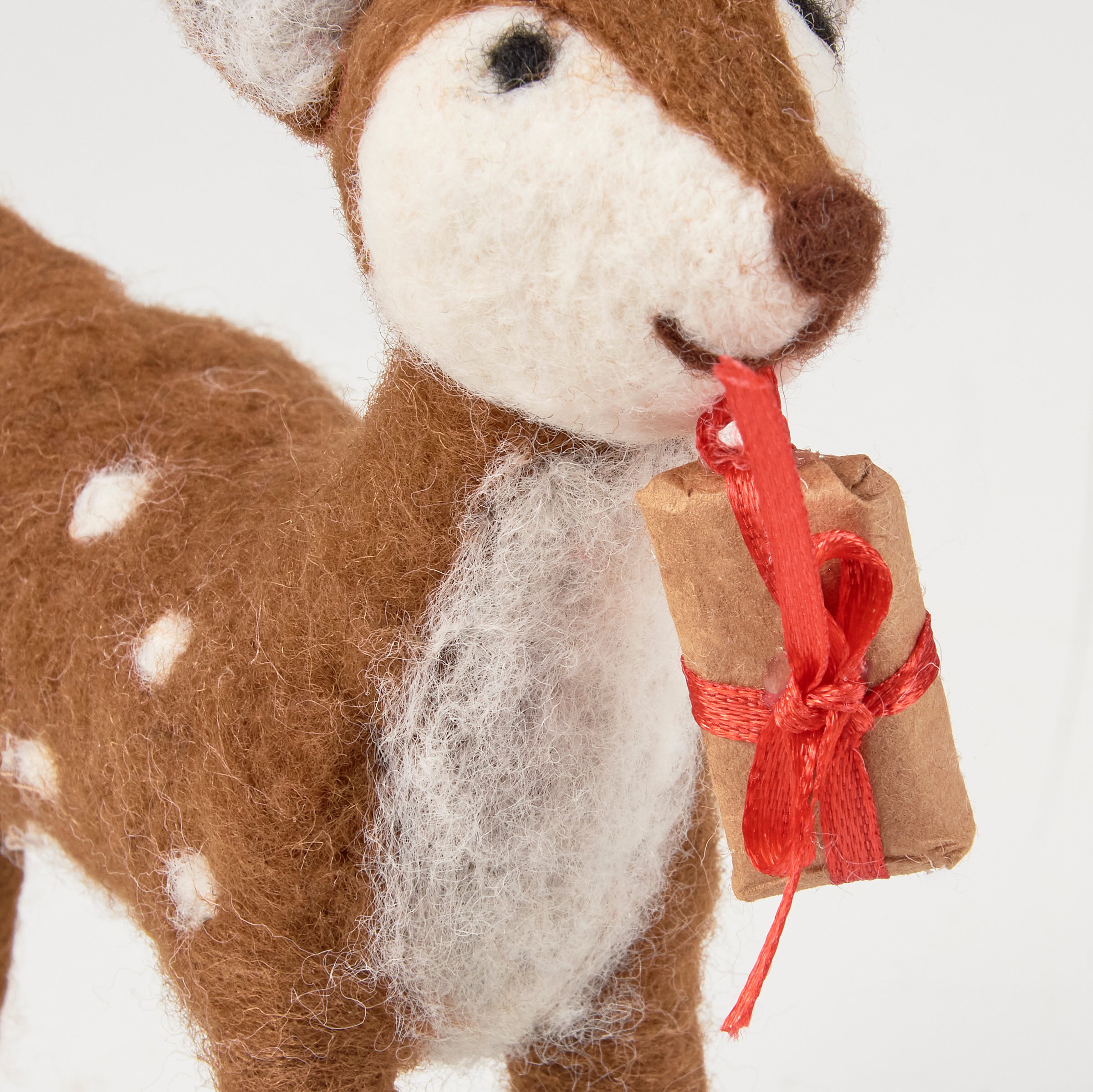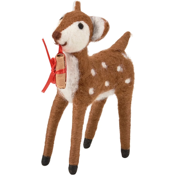 A felt critter displaying a festive deer design that coordinates well with décor from our Christmas Collection. Fawn critter features cute accents including a Christmas present tied with red ribbon hanging from its mouth. Our Christmas Fawn critter is designed to hang via included hanger or free-stand on flat surface for display. Contains small parts; this is not a toy. A cute seasonal home accent to display alone or as a collection with other seasonal critters.