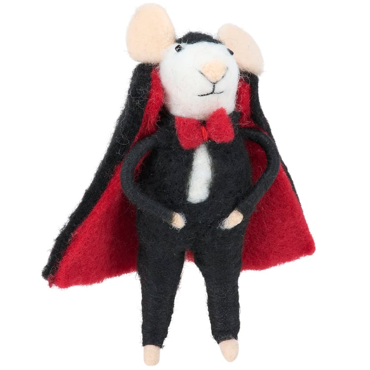 A felt critter from our Halloween Collection displaying a happy mouse wearing a Dracula costume perfect for adding character to a Halloween display at home or at work. Mouse critter features cute handmade details including a felt bowtie and molded cape on its back. Our Dracula Mouse critter is ready to hang for display via the attached hanger. Contains small parts; this is not a toy. A cute Halloween home accent that displays well alone or as a collection with other critters.