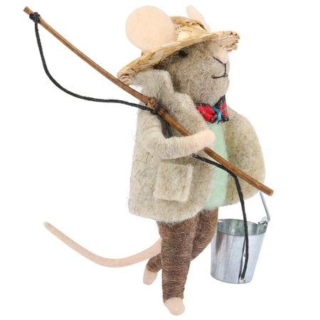 A felt critter from our Lake & Cabin Collection displaying a happy mouse with a fishing inspired design perfect for adding character to any cabin or RV. Fishing mouse critter features cute handmade details including a straw hat as well as a stick fishing rod and metal bucket in each hand. Our Fishing Mouse critter is designed to free stand on flat surface for display. Contains small parts; this is not a toy. A fun fishing themed home accent that displays well alone or as a collection with other critters.