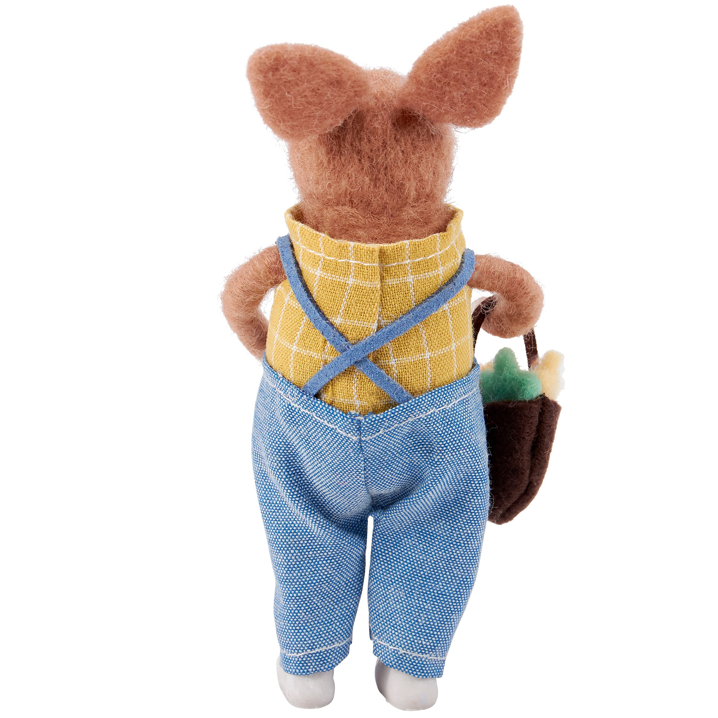 A felt critter from our Easter & Spring Collection displaying a charming bunny with a garden inspired design perfect for adding character to any space. Bunny critter features cute handmade details including a felt basket holding felt vegetables in their hand and fabric clothes. Our Food Basket Bunny critter is designed to free-stand on flat surface for display. Contains small parts; this is not a toy. A fun garden-themed home accent that displays well alone or as a collection with other critters.