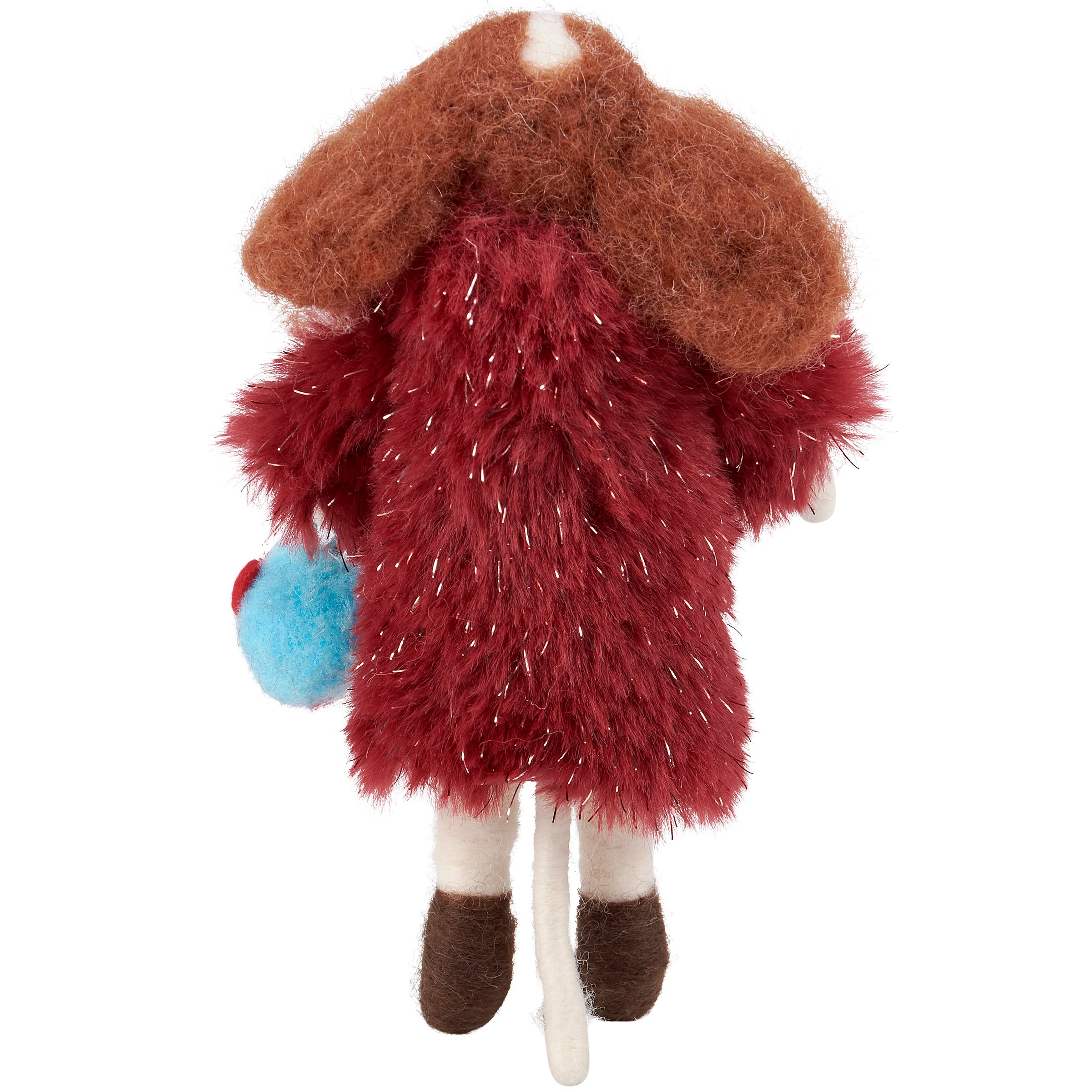 A felt critter from our Pet Collection displaying a happy dog wearing a stylish outfit perfect for adding character to any space. Dog critter features cute handmade details including tinsel accents in the coat and felt heart on the purse. Our Fur Coat Dog critter is designed to free-stand on flat surface for display. Contains small parts; this is not a toy. A fun pet-themed home accent that displays well alone or as a collection with other critters.