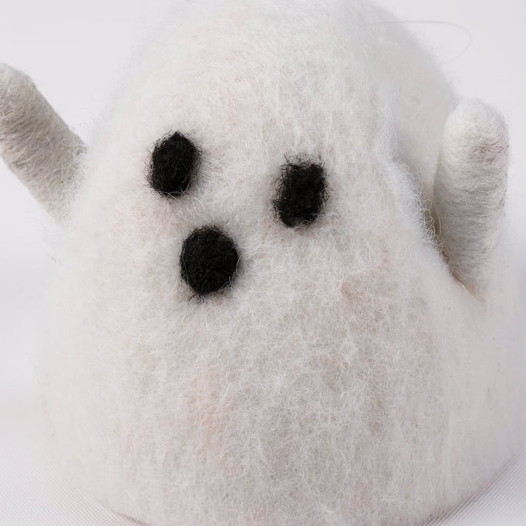 A felt critter displaying a classic white ghost design that coordinates well with décor from our Halloween Collection. Ghost critter features cute accents including posed arms and "boo" face. Our Ghost critter is designed to free-stand on flat surface for display. A cute seasonal home accent to display alone or as a collection with other critters. Contains small parts; this is not a toy.