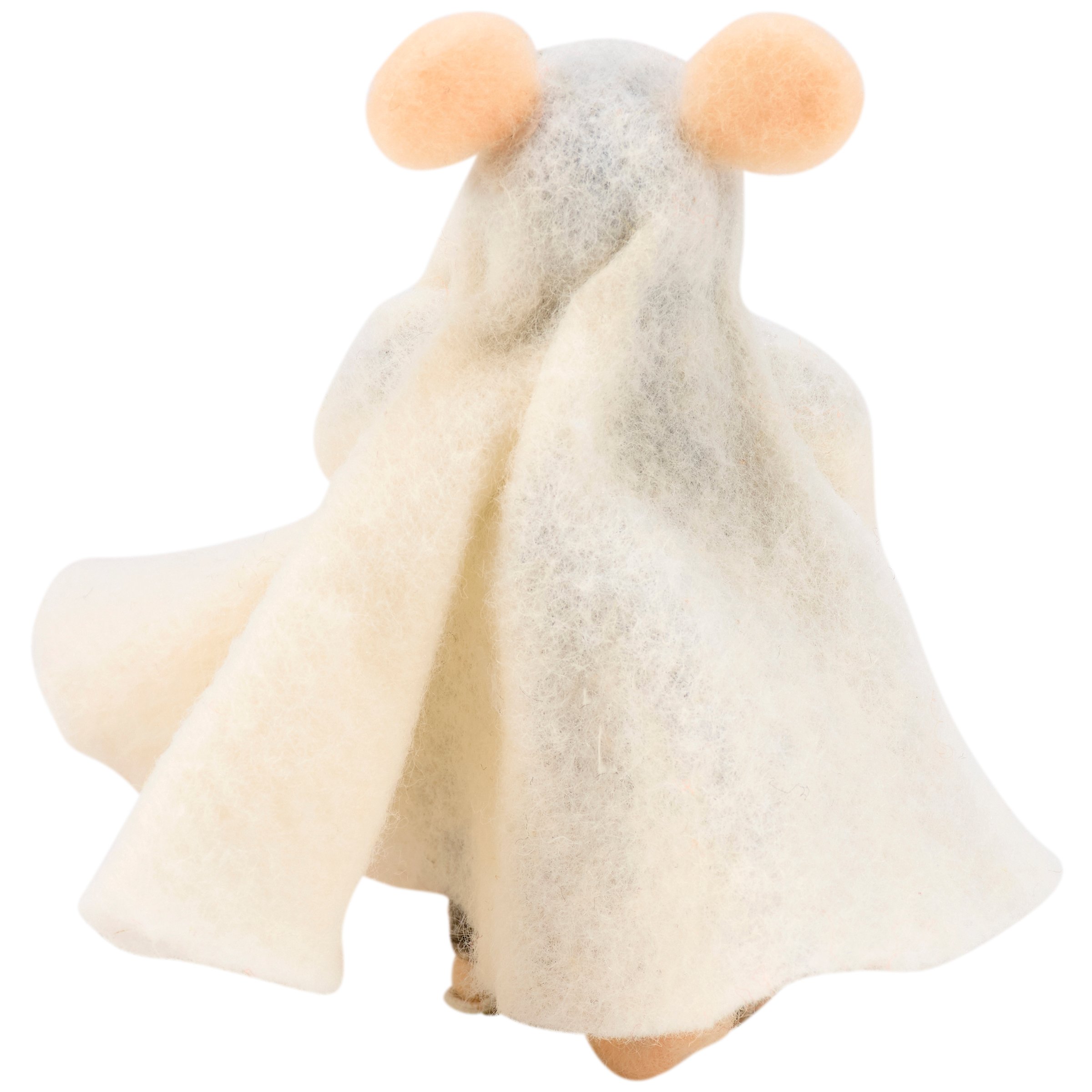 A felt critter from our Halloween Collection displaying a mouse dressed for trick or treating wearing a ghost costume perfect for adding character to any seasonal display. Halloween mouse critter features cute handmade details including felt treat bucket and flowing felt ghost costume. Our Ghost Mouse critter is designed to free-stand on flat surface for display. Contains small parts; this is not a toy. A fun Halloween home accent that displays well alone or as a collection with other critters.