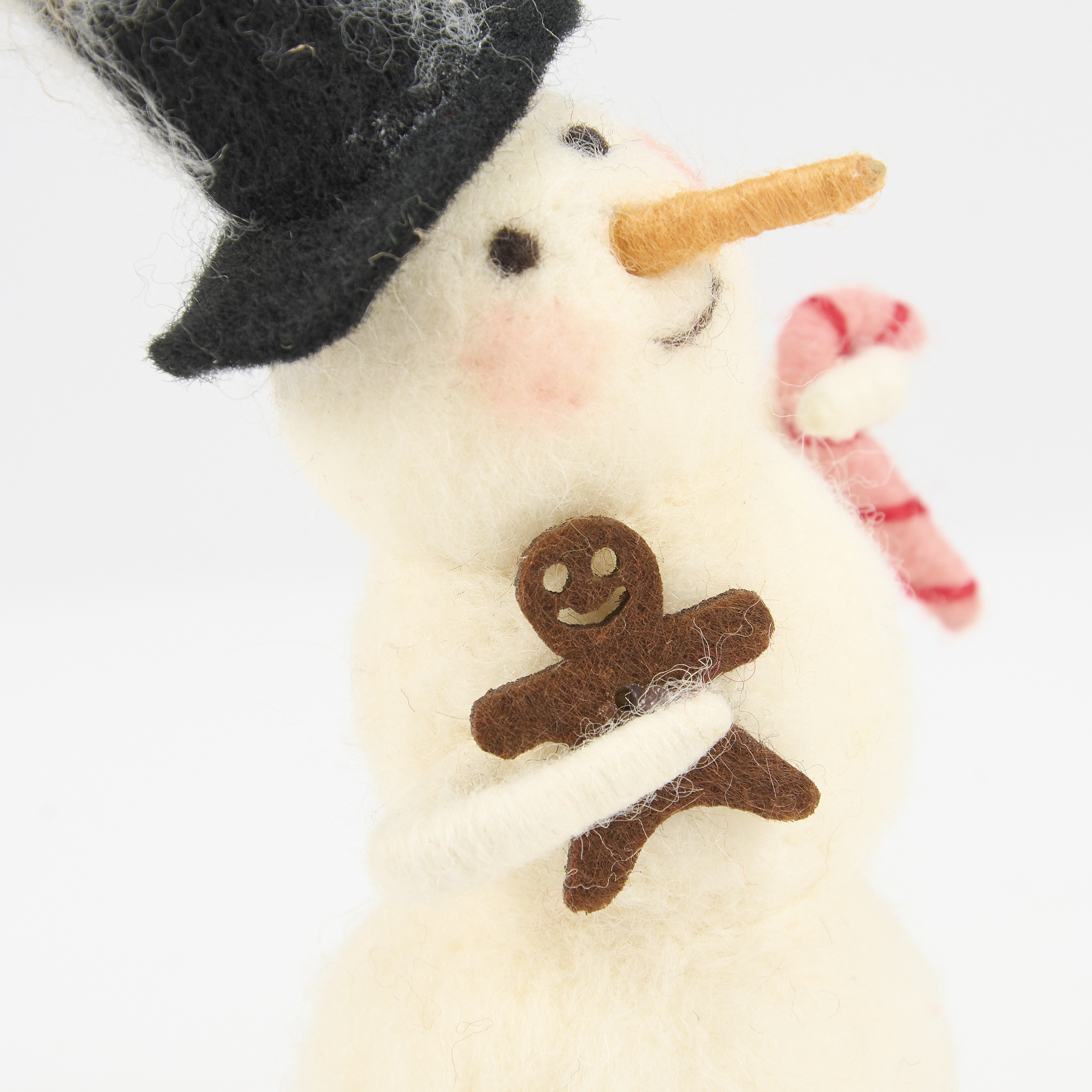 A felt critter from our Christmas Collection displaying a happy snowman design perfect for adding character to any seasonal display. Snowman critter features cute handmade details including felt gingerbread cookie and candy cane in its hands and snowy detail on the hat. Our Gingerbread Snowman critter is designed to free-stand on flat surface for display. Contains small parts; this is not a toy. A fun Christmas home accent that displays well alone or as a collection with other critters.
