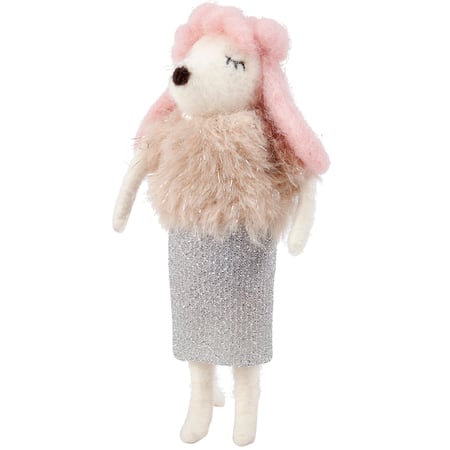 A felt critter from our Pet Collection displaying a poodle wearing a glamorous outfit perfect for adding character to any space. Poodle critter features cute handmade details including tinsel accents in the sweater and metallic fabric skirt. Our Glamour Poodle critter is designed to free-stand on flat surface for display. Contains small parts; this is not a toy. A fun pet-themed home accent that displays well alone or as a collection with other critters.