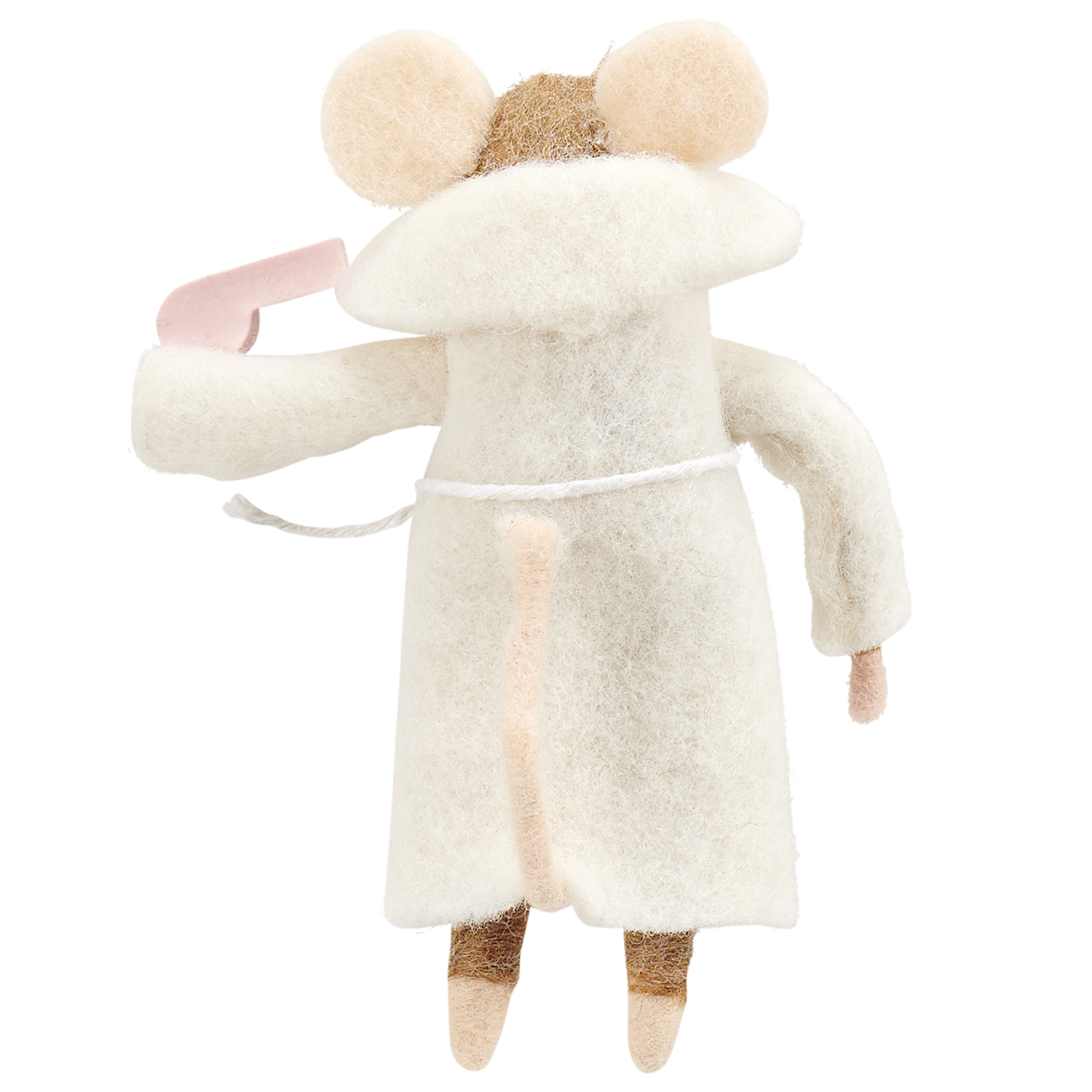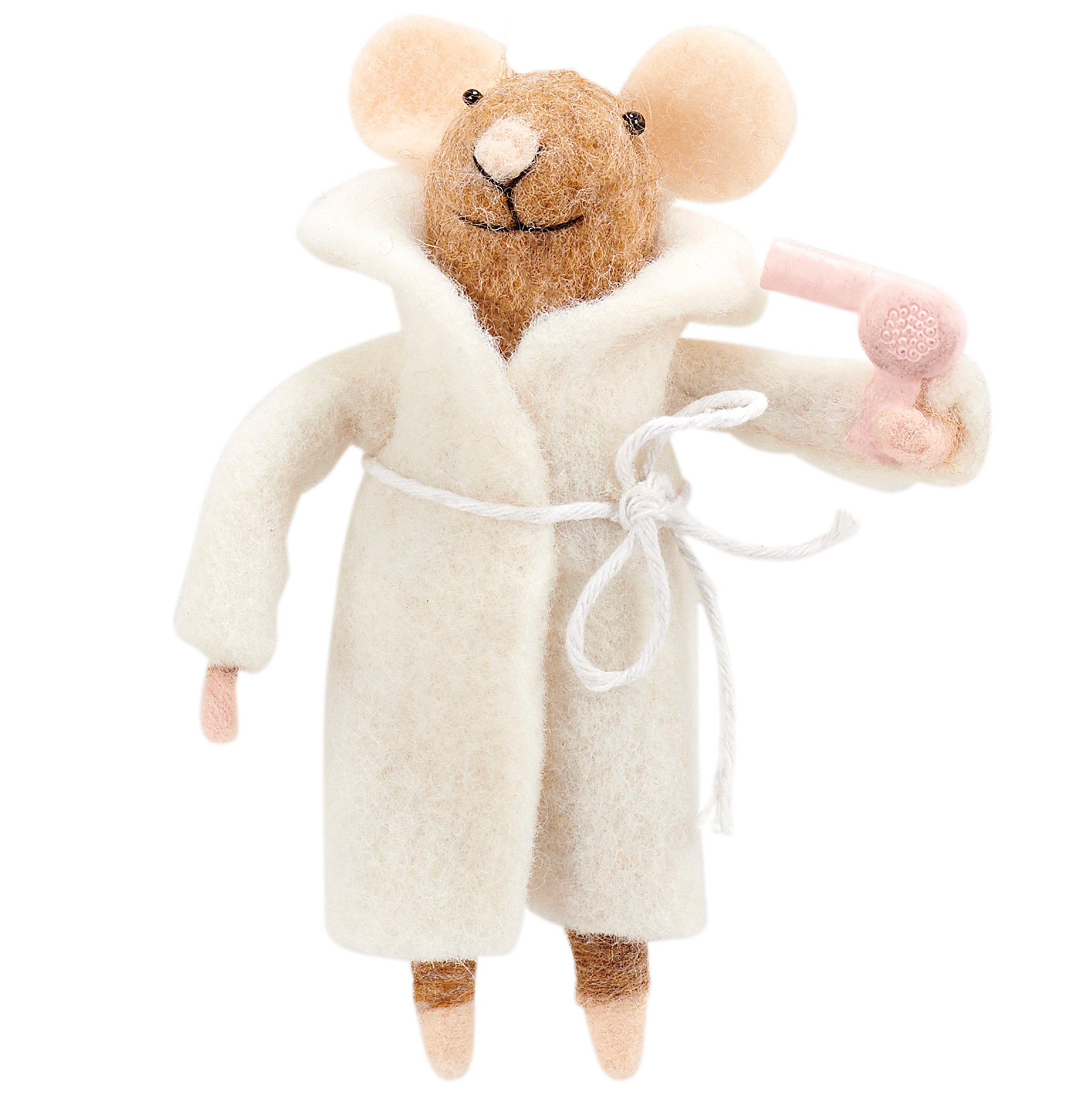 A felt critter from our Bathroom Collection displaying a happy mouse with a bathtime inspired design perfect for adding character to any bathroom. Mouse critter features cute accents including a felt bathrobe with string tie and a pink hair dryer in their hand. Our Hair Dryer Mouse critter is designed to free-stand on flat surface for display. Contains small parts; this is not a toy. A fun everyday home accent to display alone or as a collection with other critters.