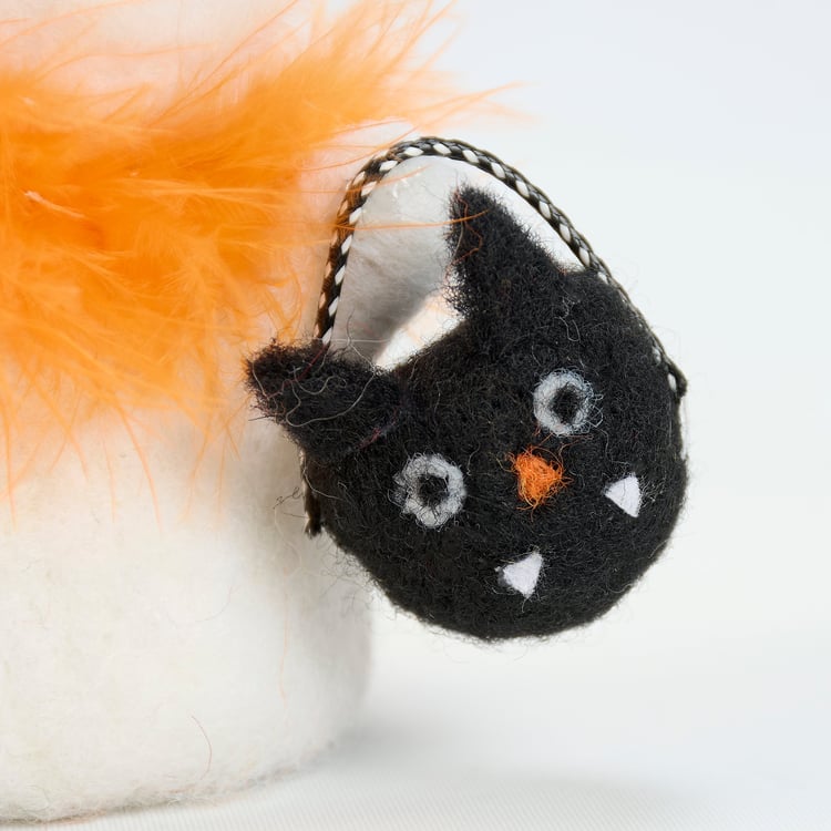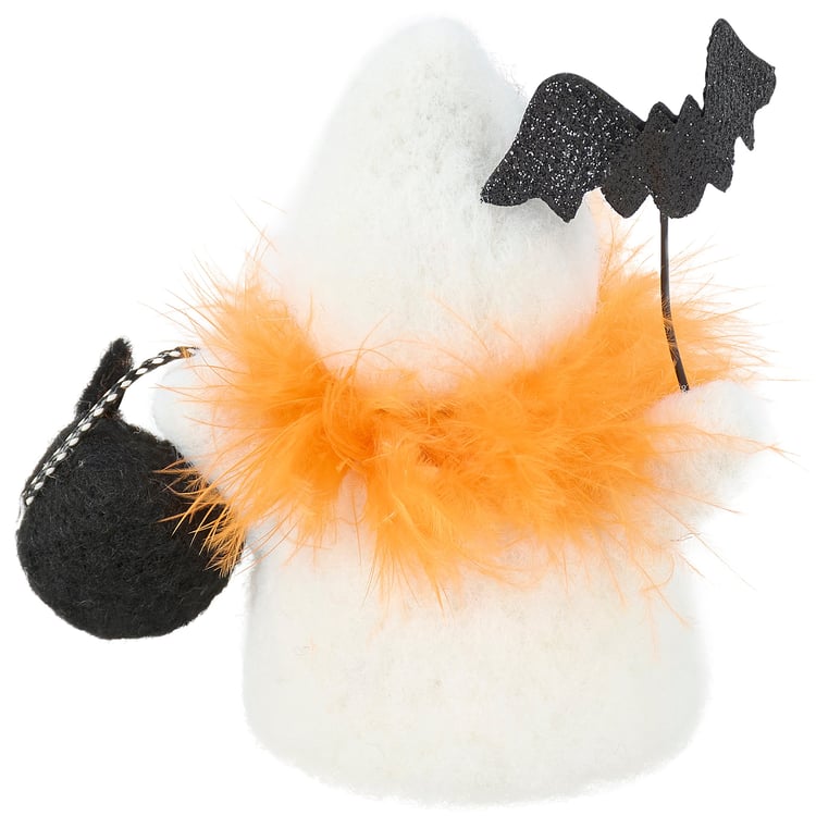 A felt critter from our Halloween Collection displaying a ghost dressed for trick or treating perfect for adding character to any seasonal display. Halloween ghost critter features cute handmade details including felt black cat treat bucket with black glitter bat accessory and orange feather detail. Our Halloween Ghost critter is designed to free-stand on flat surface for display. Contains small parts; this is not a toy. A fun Halloween home accent that displays well alone or as a collection with other critters.