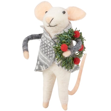 A felt critter displaying a mouse holding a holiday wreath that coordinates well with décor from our Christmas Collection. Mouse critter features cute accents including a festive knit sweater and felt berry details on the wreath. Our Holiday Mouse critter is designed to hang via included hanger or free-stand on a flat surface for display. Contains small parts; this is not a toy. A cute seasonal home accent to display alone or as a collection with other seasonal critters.