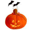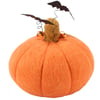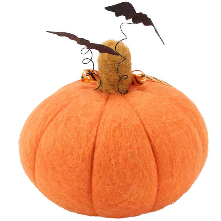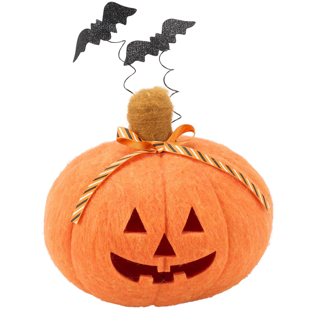 A felt critter from our Halloween Collection displaying a fun jack o'lantern pumpkin design with wire lights inside to illuminate the face cutouts. Halloween pumpkin critter features cute handmade details including black and orange ribbon bow on the stem and glitter bats on coiled wires. Our Lighted Pumpkin critter is designed to free-stand on flat surface for display. Contains small parts; this is not a toy. A felt Halloween home accent that adds fun seasonal lighting to any space.