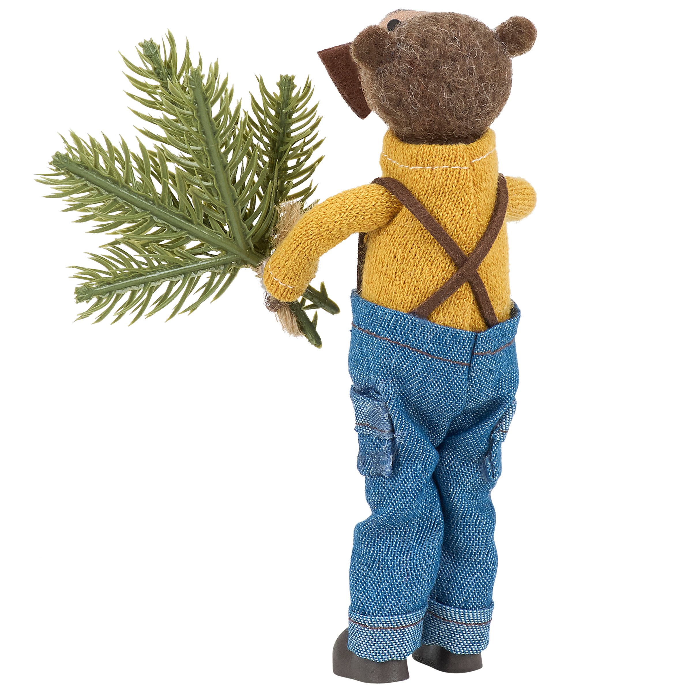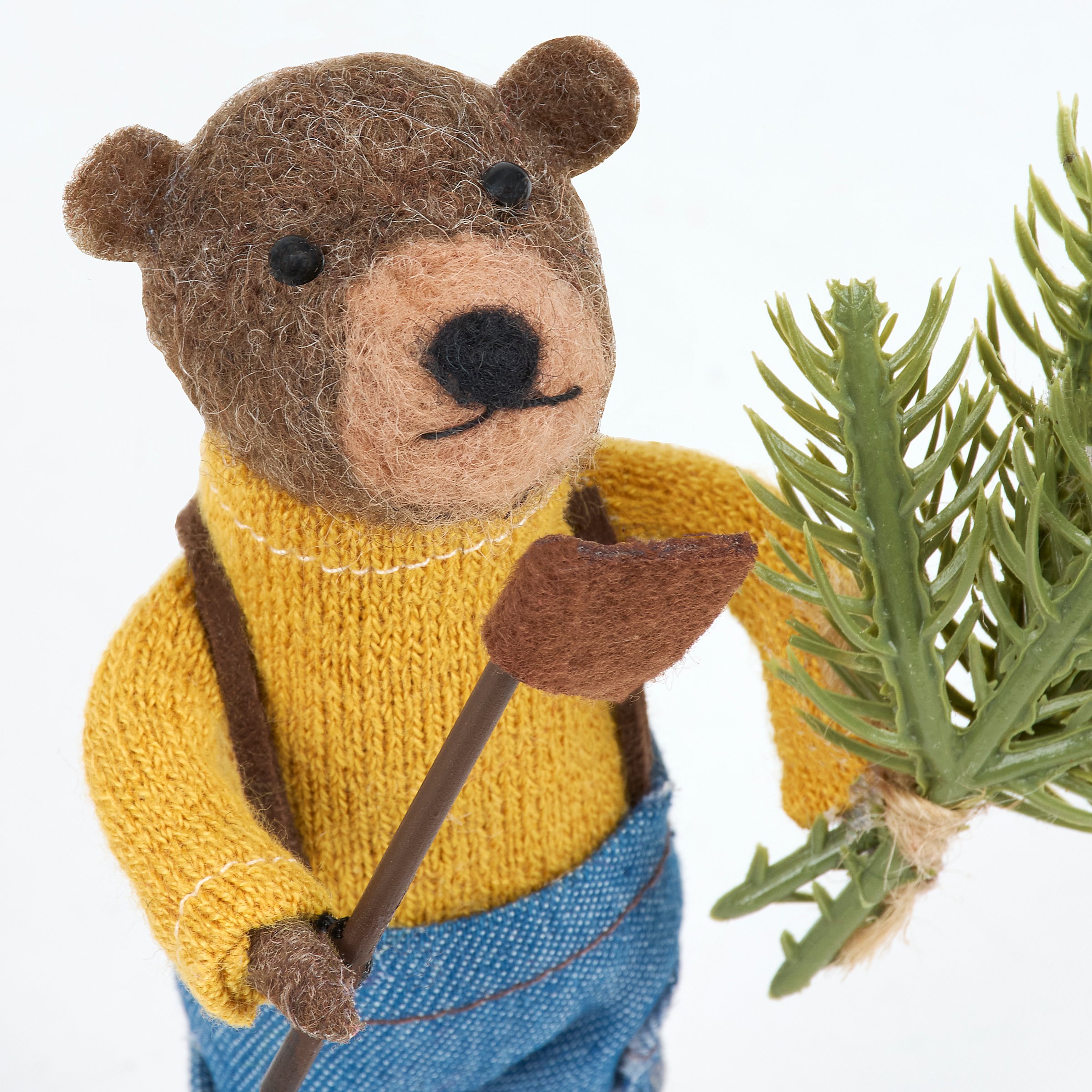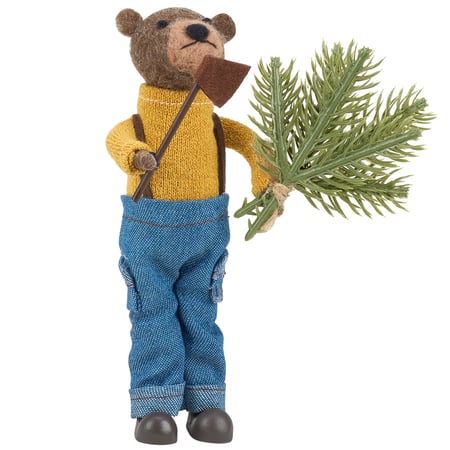 A felt critter from our Christmas Collection displaying a bear dressed as a lumberjack perfect for adding character to a Christmas display at home or in a cabin. Winter bear critter features cute handmade details including fabric clothing as well as faux greenery and an axe in its hands. Our Lumberjack Bear critter is ready to hang for display via the attached hanger. Contains small parts; this is not a toy. An outdoor themed home accent that displays well alone or as a collection with other critters.