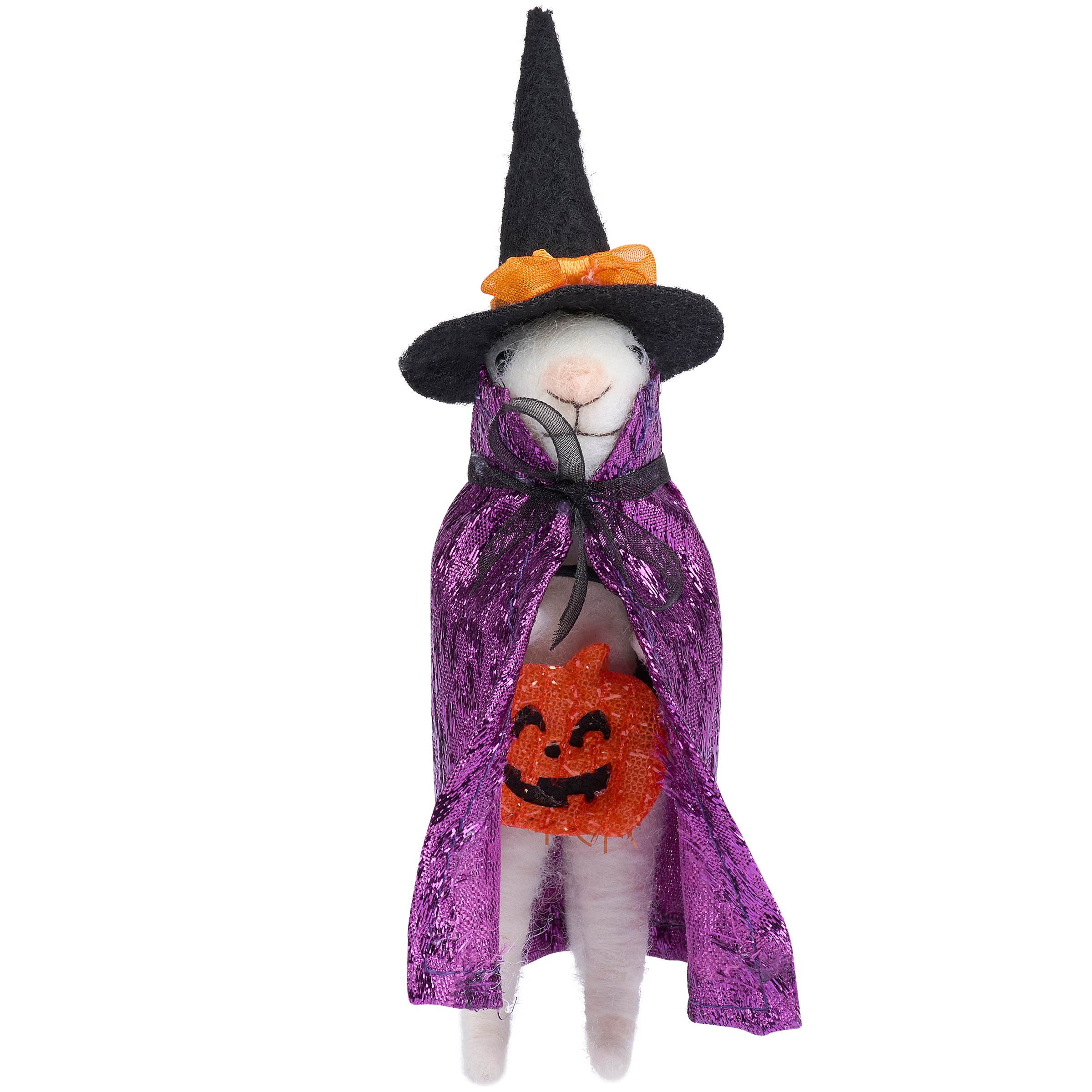 A felt critter from our Halloween Collection displaying a happy mouse wearing a witch costume perfect for adding character to a Halloween display at home or at work. Mouse critter features cute handmade details including a fabric cape on its back with ribbon tie. Our Mouse Witch critter is ready to hang for display via the attached hanger. Contains small parts; this is not a toy. A cute Halloween home accent that displays well alone or as a collection with other critters.