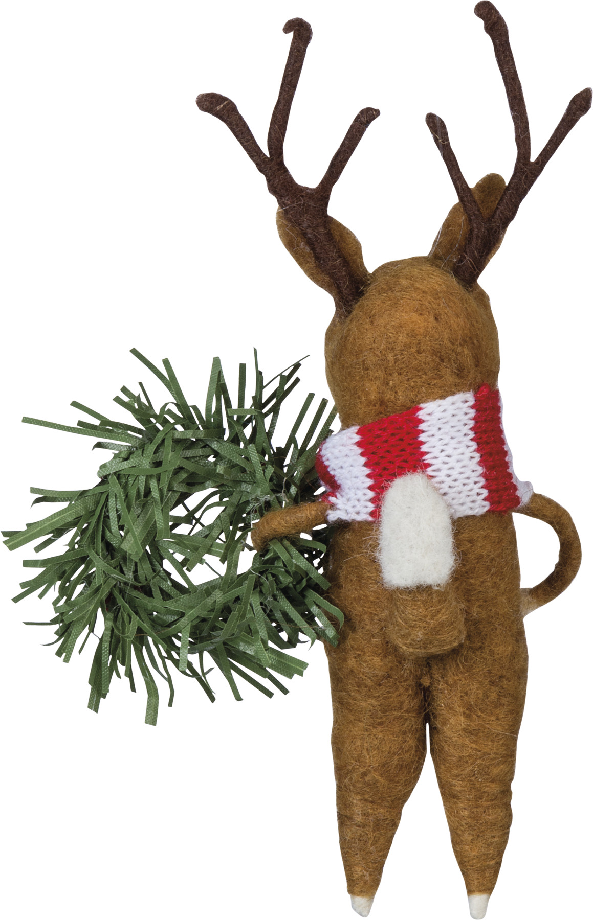 A charming touch to the holidays, this felt reindeer ornament features a scarf and wreath detail with top loop for easy hanging. Complements well with coordinating styles for a cohesive collection.