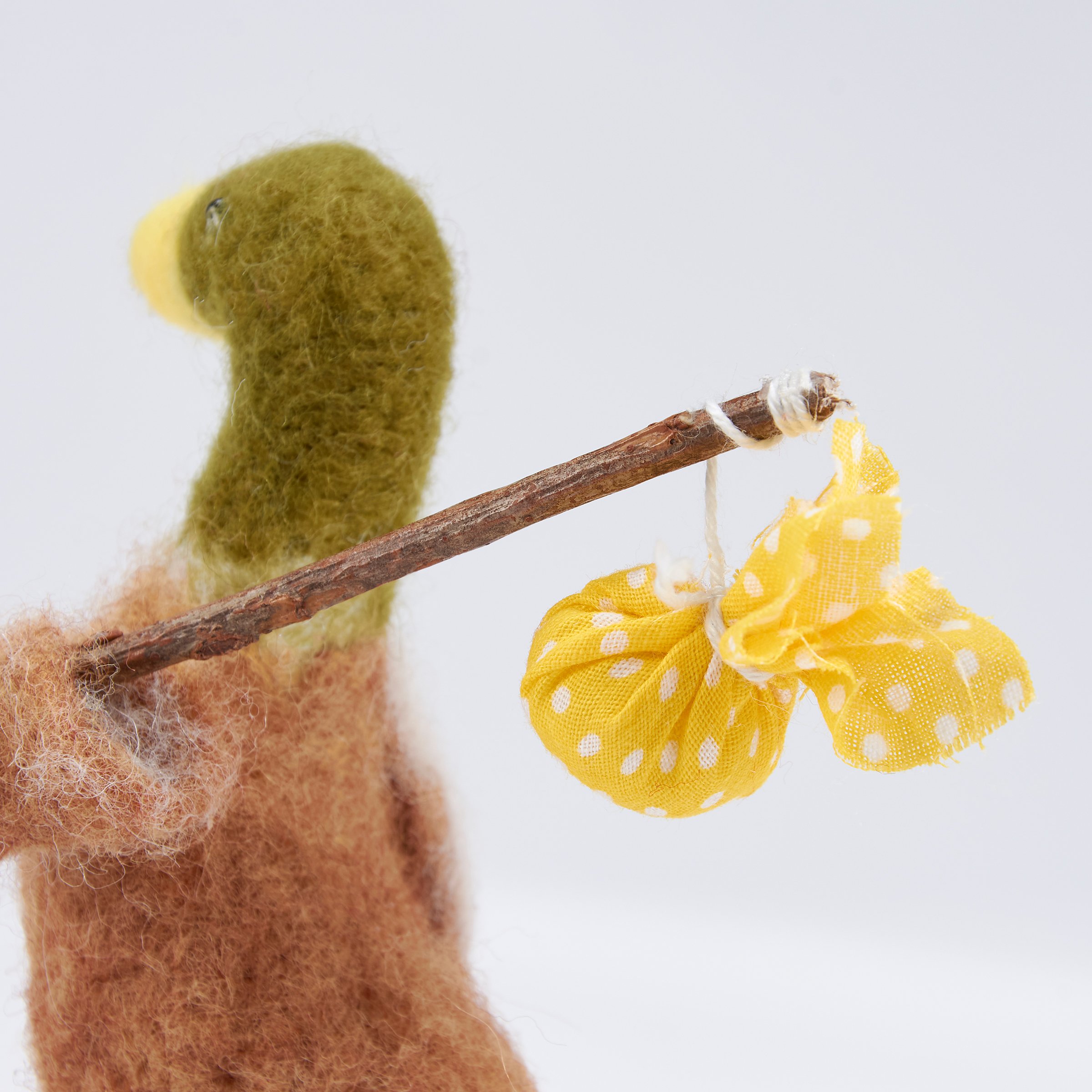 A felt critter from our Lake & Cabin Collection displaying a charming duck holding a bindle perfect for adding character to any cabin or RV. Duck critter features cute handmade details including wooden stick for the bindle and sturdy wire feet with layered felt for webbing. Our Runaway Duck critter is designed to free-stand on flat surface for display. Contains small parts; this is not a toy. A fun outdoor-themed home accent that displays well alone or as a collection with other critters.