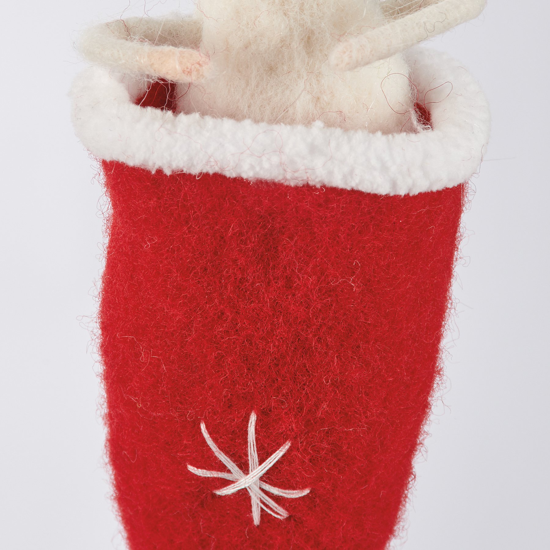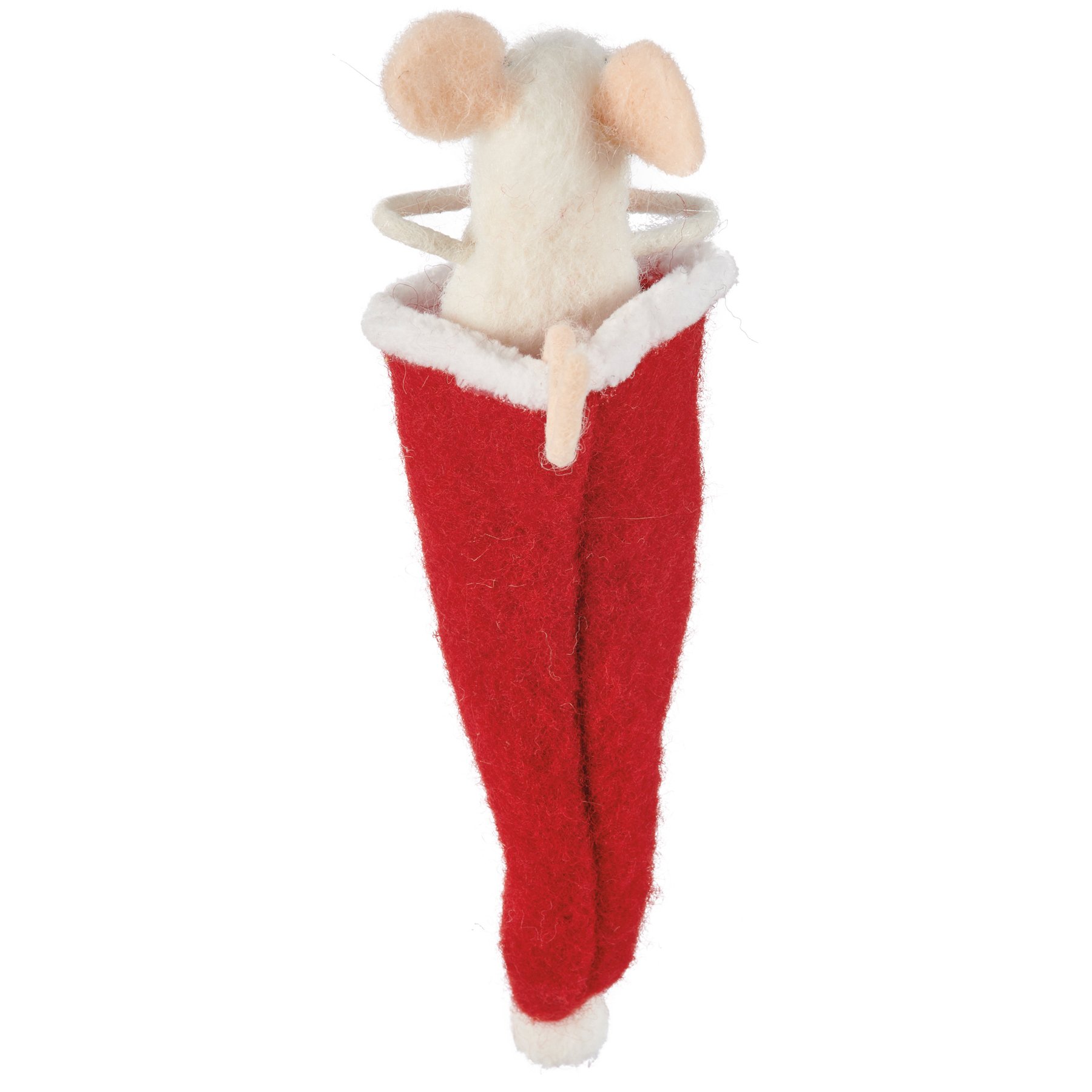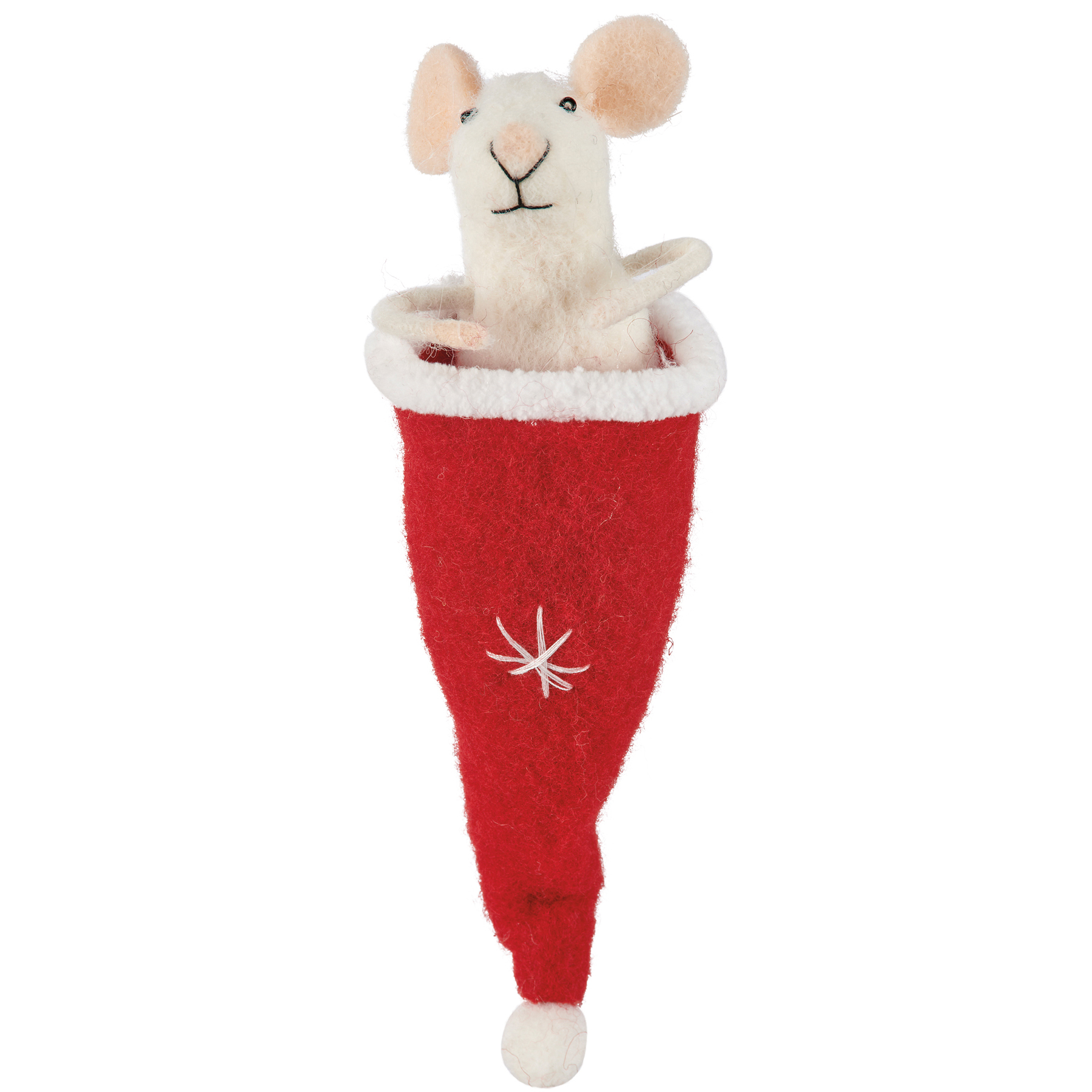 A felt critter from ourĀ Christmas Collection displaying a mouse peeking out from a Santa hat. Critter features stitched details. Our Santa Hat Mouse critter is designed to hang via included hanger. A cute seasonal home accent to display alone or as a collection with other critters. Contains small parts; this is not a toy.