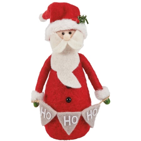 A felt critter from our Christmas Collection displaying Santa holding a banner that says "Ho Ho Ho." Critter features felt and jute details. Our Santa Ho Ho Ho critter is designed to free-stand on flat surface. A cute seasonal home accent to display alone or as a collection with other critters. Contains small parts; this is not a toy.