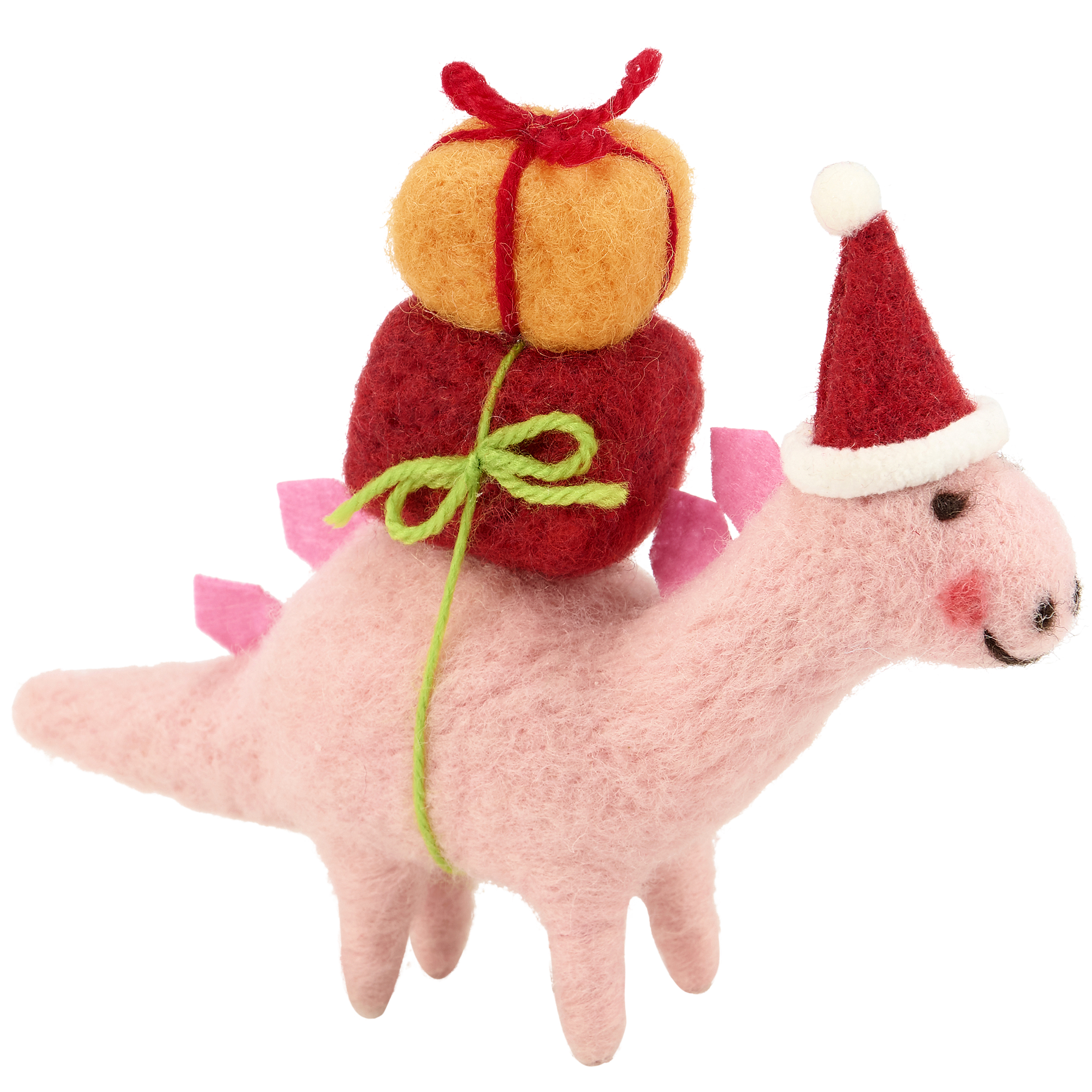 A felt critter from our Christmas Collection displaying a pastel pink stegosaurus dressed like Santa perfect for adding character to any seasonal display. Christmas dinosaur critter features cute handmade details including felt presents on its back with string tie. Our Santa Stegosaurus critter is designed to free-stand on flat surface for display. Contains small parts; this is not a toy. A fun dinosaur-themed Christmas home accent that displays well alone or as a collection with other critters.