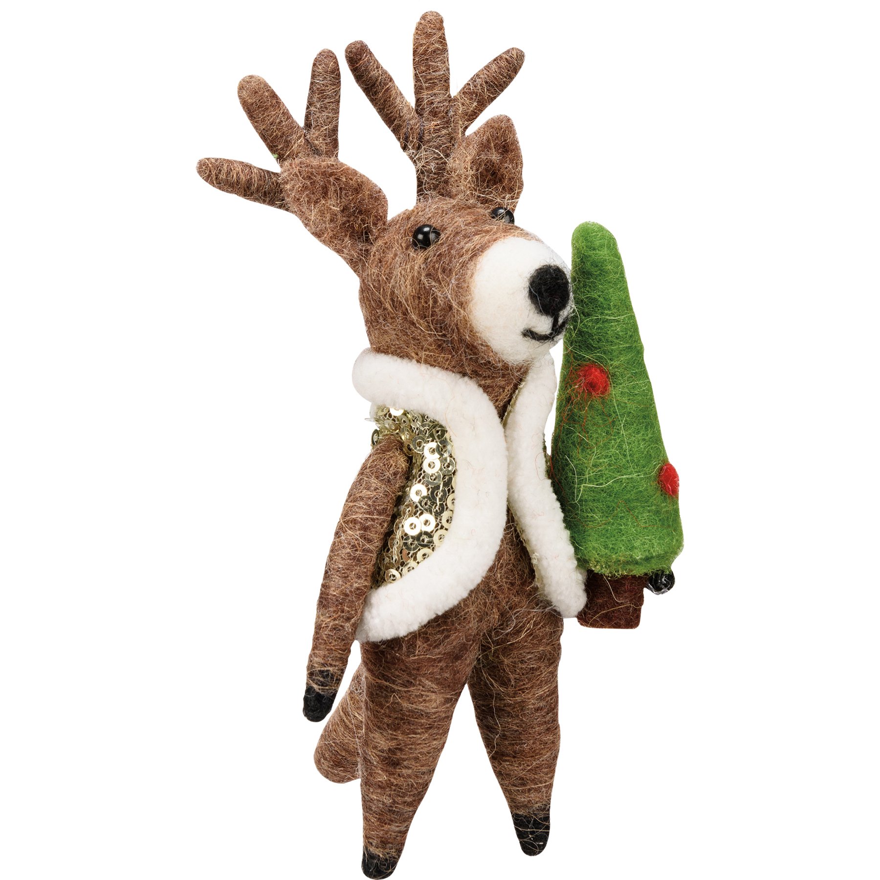 A set of two felt critter deer wearing jackets and holding a mini Christmas tree. Our Christmas Deer critter set makes a great addition to any holiday décor. This is not a toy.