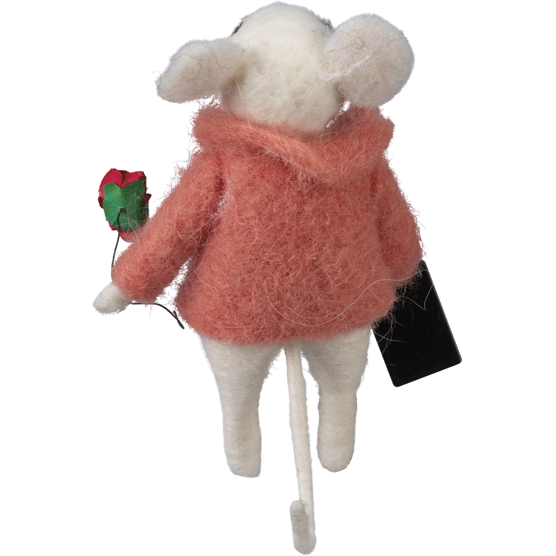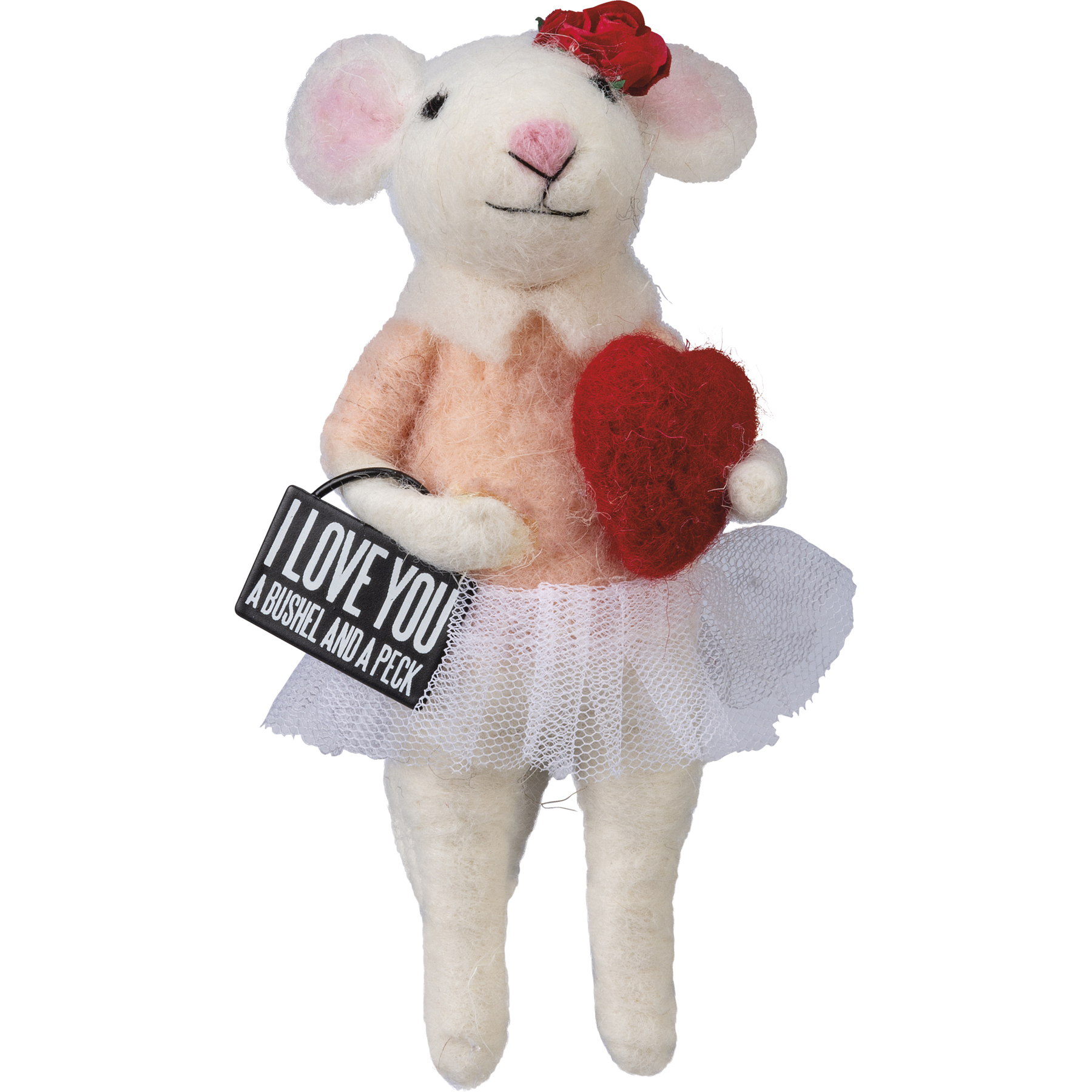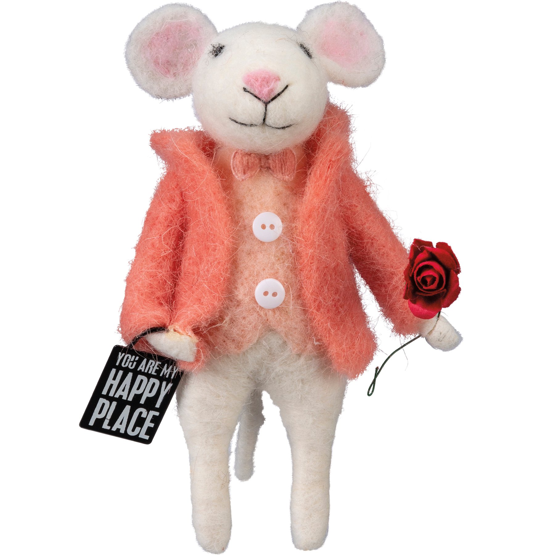 A set of two felt mice featuring heart and flower accents. Mice are holding metal box sign style signs with "You Are My Happy Place" and "I Love You A Bushel And A Peck" sentiments.