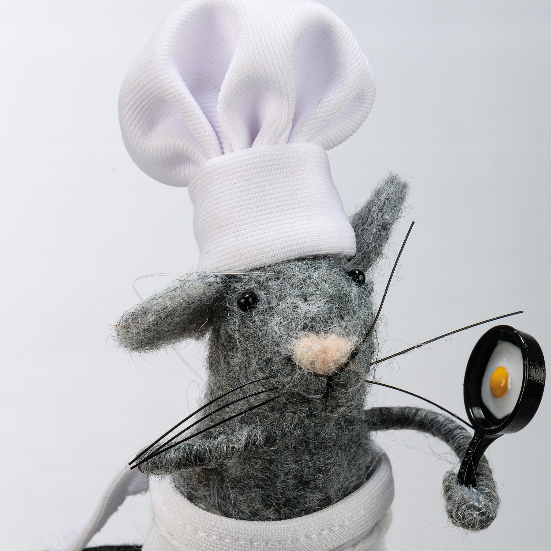 A set of two felt critter mice from our Kitchen Collection wearing chef hats and aprons. One is holding a frying pan and the other is holding a large spoon. Our Kitchen Mice critter set makes a great addition to any kitchen décor. This is not a toy.